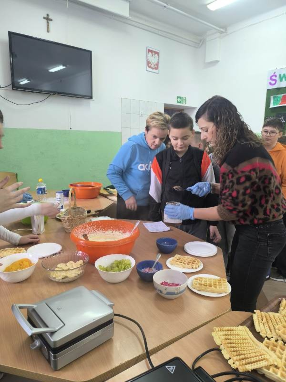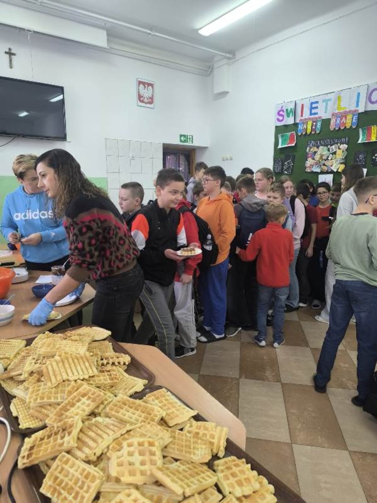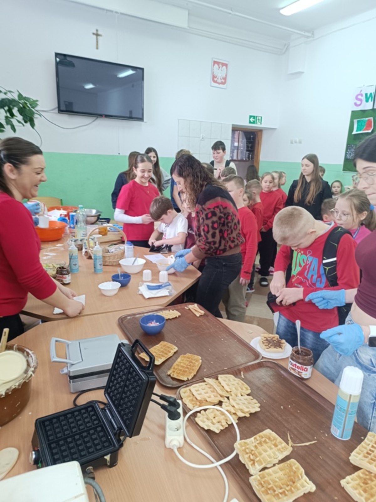 Uczniowie mieli możliwość zakupu słodkich przysmaków z różnorodnymi dodatkami. Zainteresowanie akcją było ogromne – przygotowane porcje znikały w mgnieniu oka, a na twarzach uczniów gościły szerokie uśmiechy. Tego dnia kalorie zdecydowanie nie były najważniejsze – liczyła się dobra zabawa i wspólne świętowanie.
