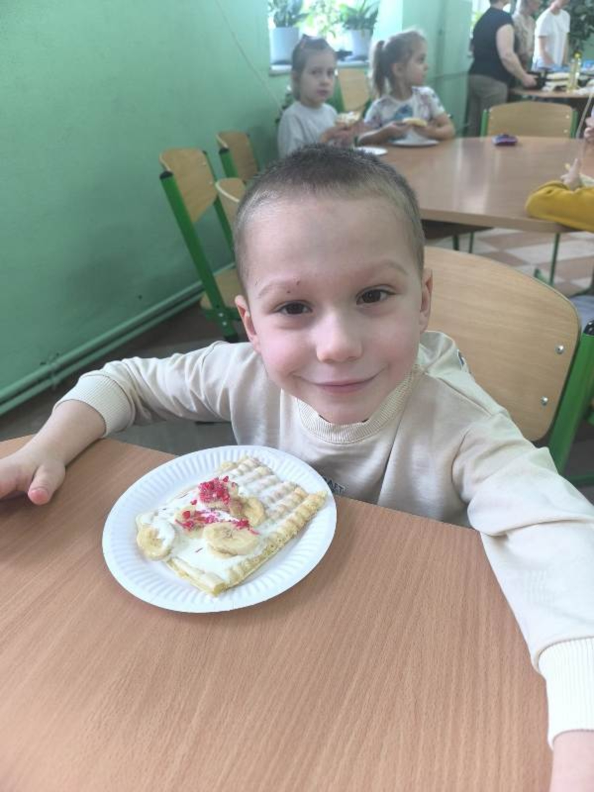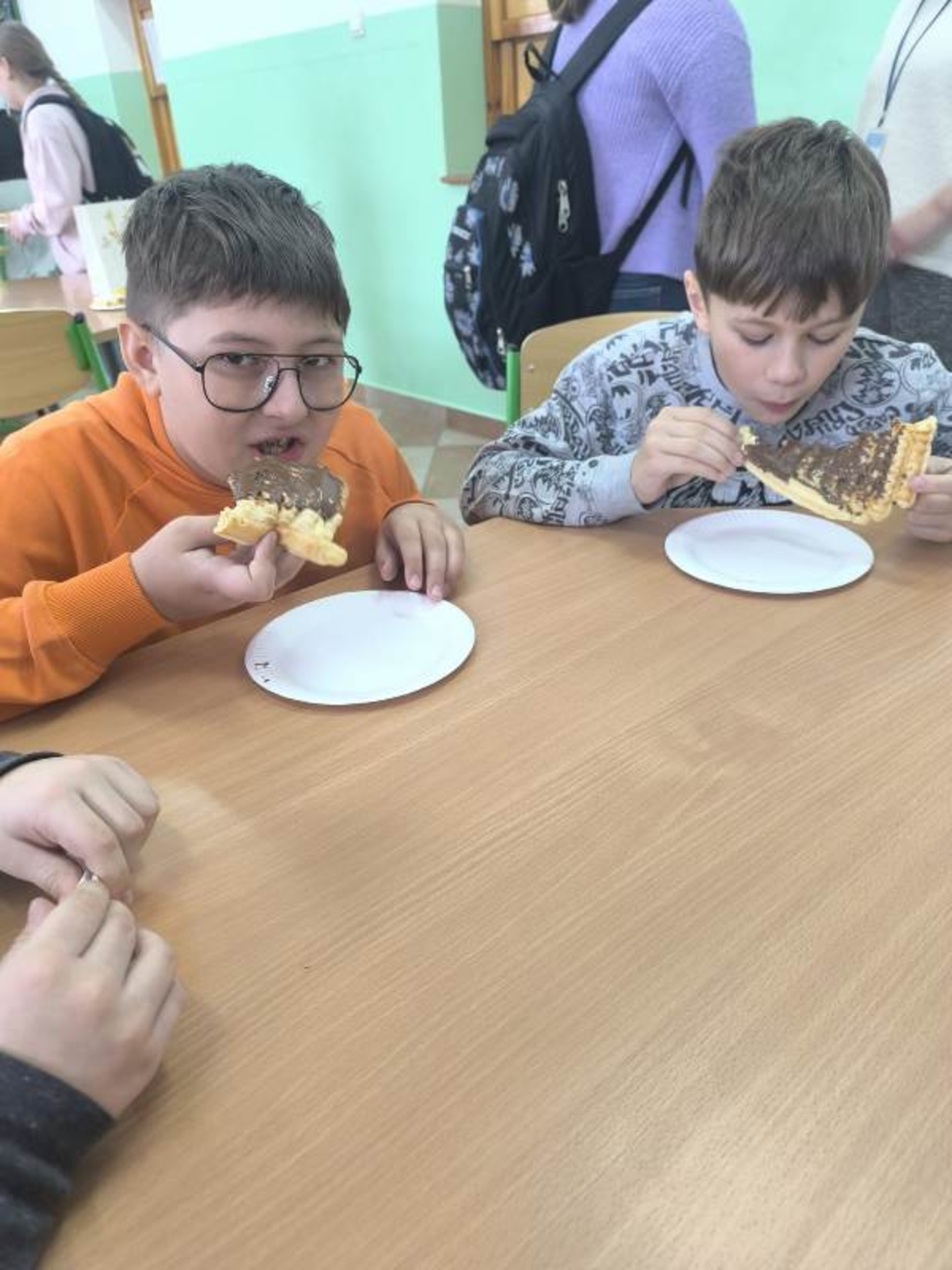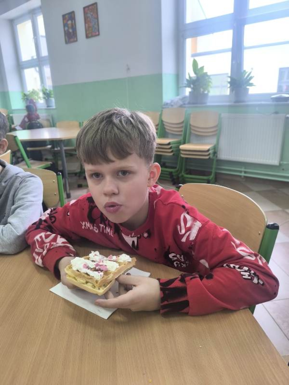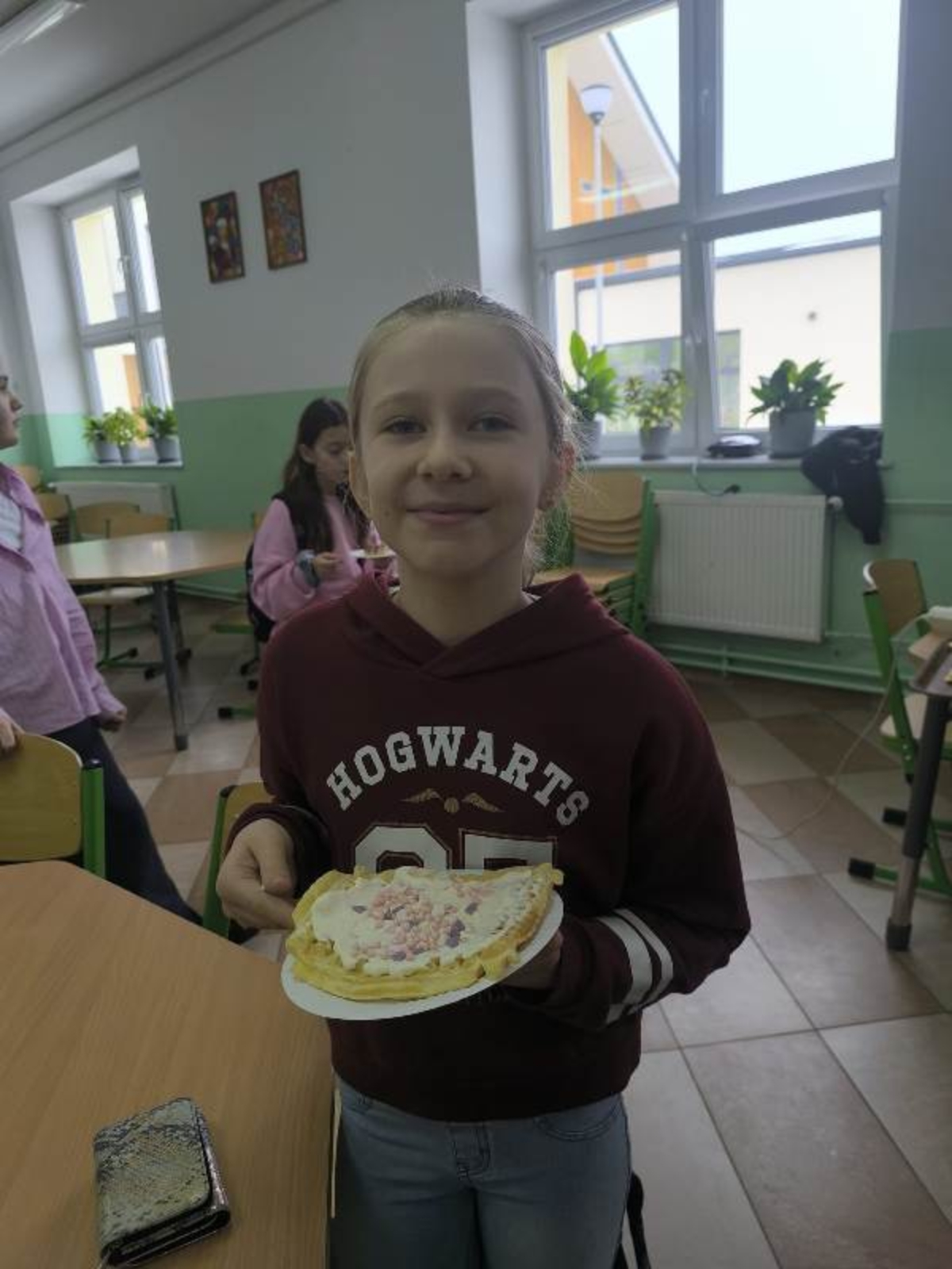 Uczniowie mieli możliwość zakupu słodkich przysmaków z różnorodnymi dodatkami. Zainteresowanie akcją było ogromne – przygotowane porcje znikały w mgnieniu oka, a na twarzach uczniów gościły szerokie uśmiechy. Tego dnia kalorie zdecydowanie nie były najważniejsze – liczyła się dobra zabawa i wspólne świętowanie.