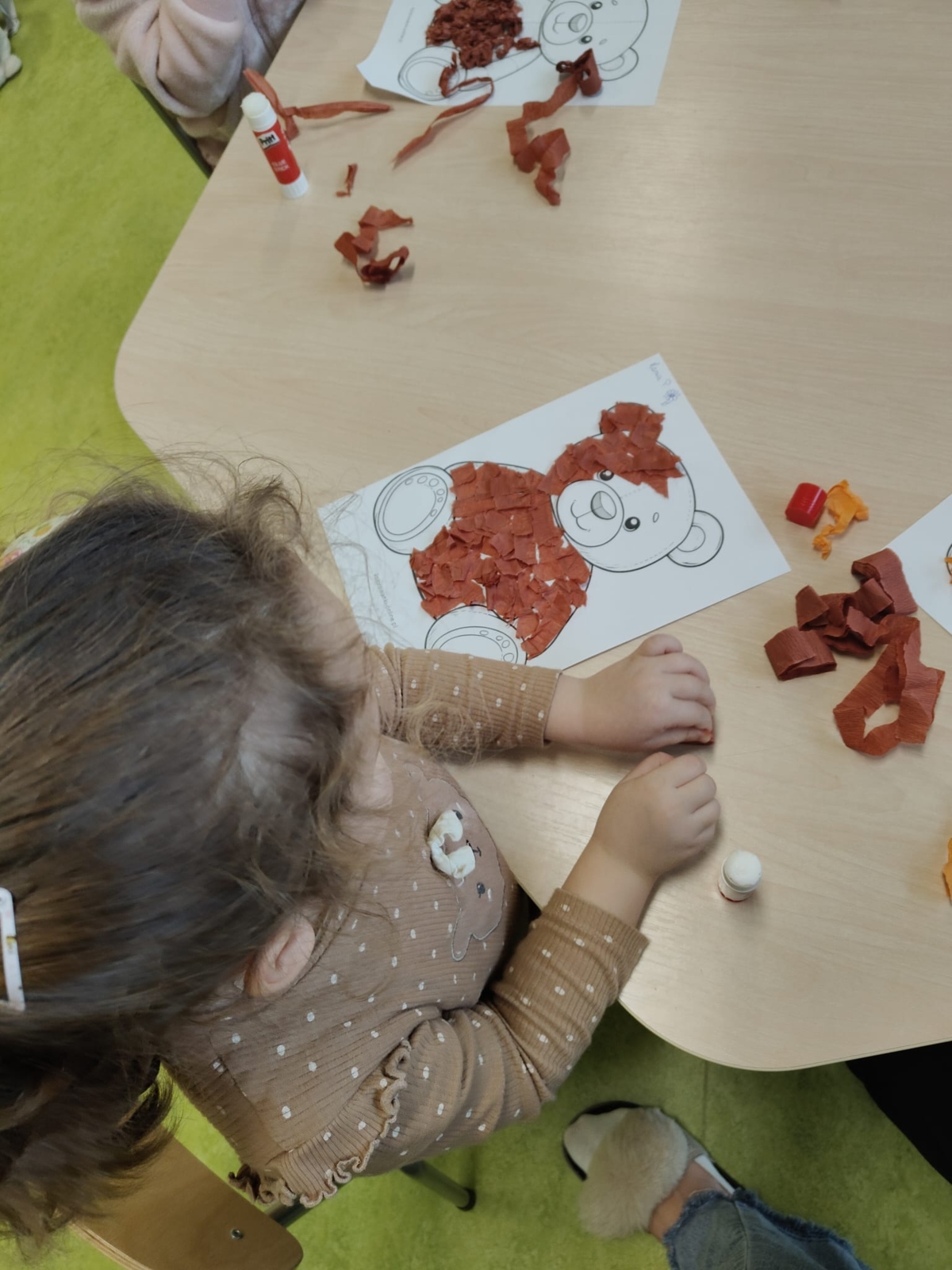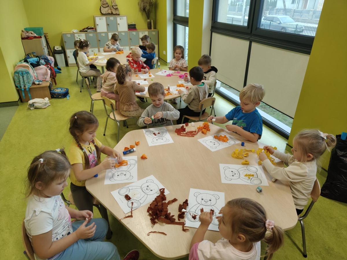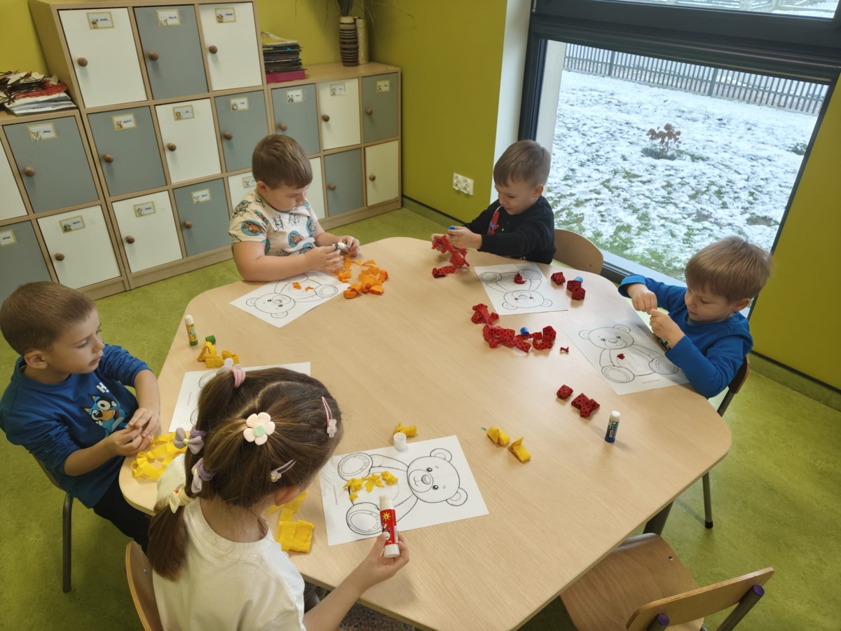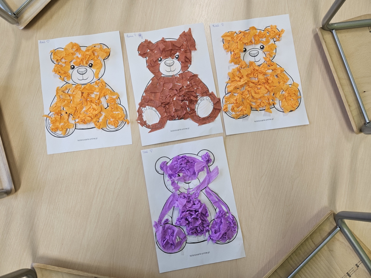 Następnie dzieci poznały historię powstania pluszowego misia , odgadywały zagadki, utrwalały kolory, wspólnie śpiewaliśmy wesołe piosenki i tańczyliśmy przy ulubionych melodiach. Na koniec dzieci w grupach miały okazję narysować swojego misia, wykleić bibułą.
