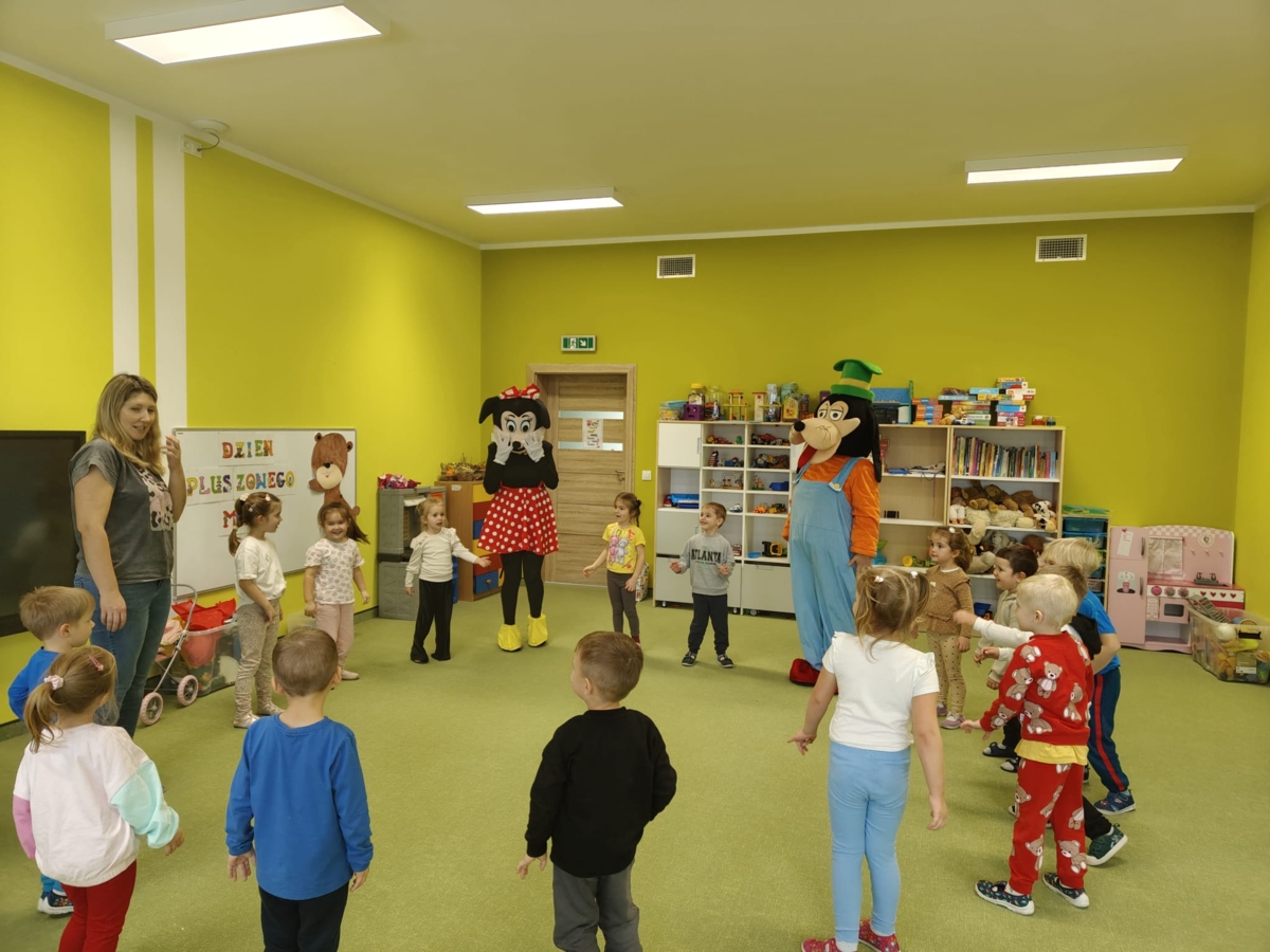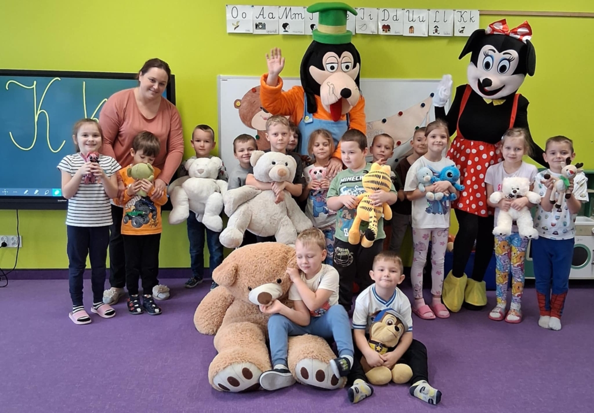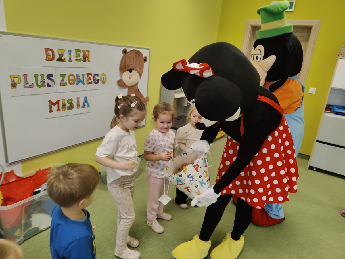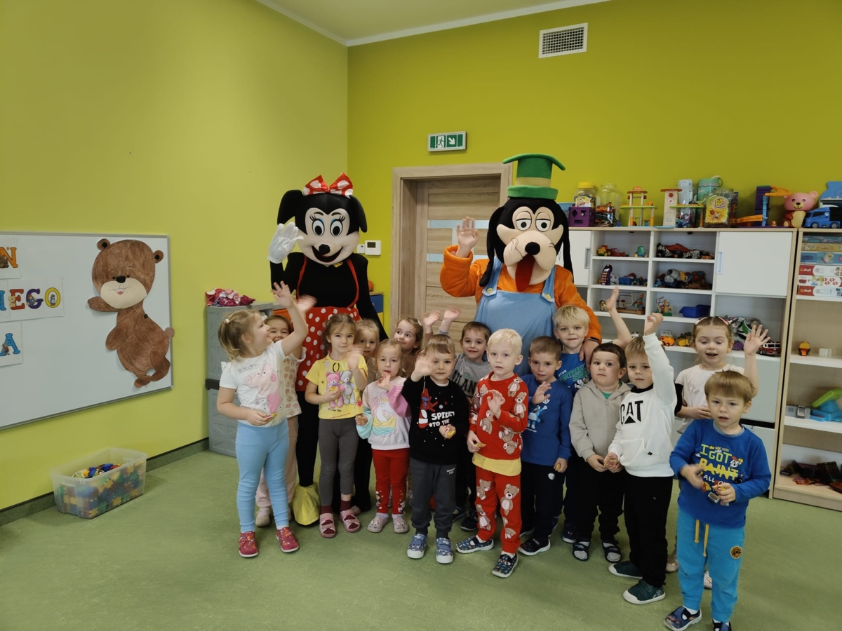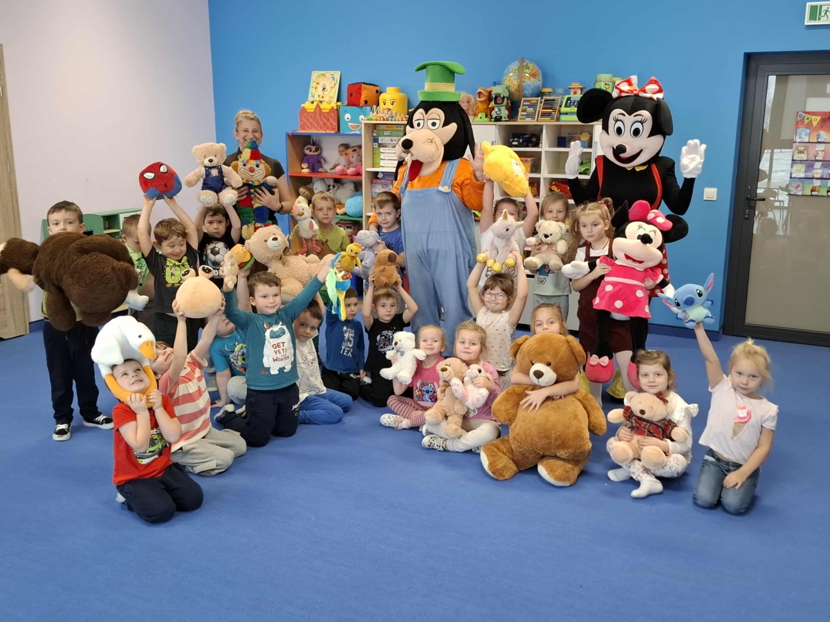 Dziś w naszym przedszkolu obchodziliśmy radosny Dzień Pluszowego Misia. Z tej okazji dzieci oraz panie przyniosły swoje ulubione pluszowe przytulanki, które towarzyszyły nam przez cały dzień. Niespodzianką była wizyta dwóch bajkowych maskotek – Goofiego i Myszki Miki, z którymi dzieci miały okazję wspólnie się pobawić. Bajkowe postacie swoją obecnością wywołały wielką radość u dzieci. Na zakończenie wizyty dzieciom zostały podarowane słodkie upominki.