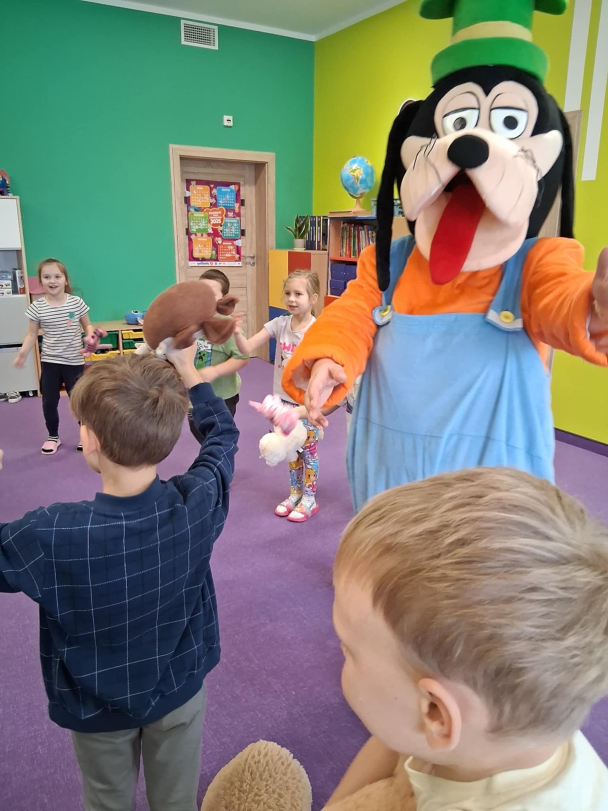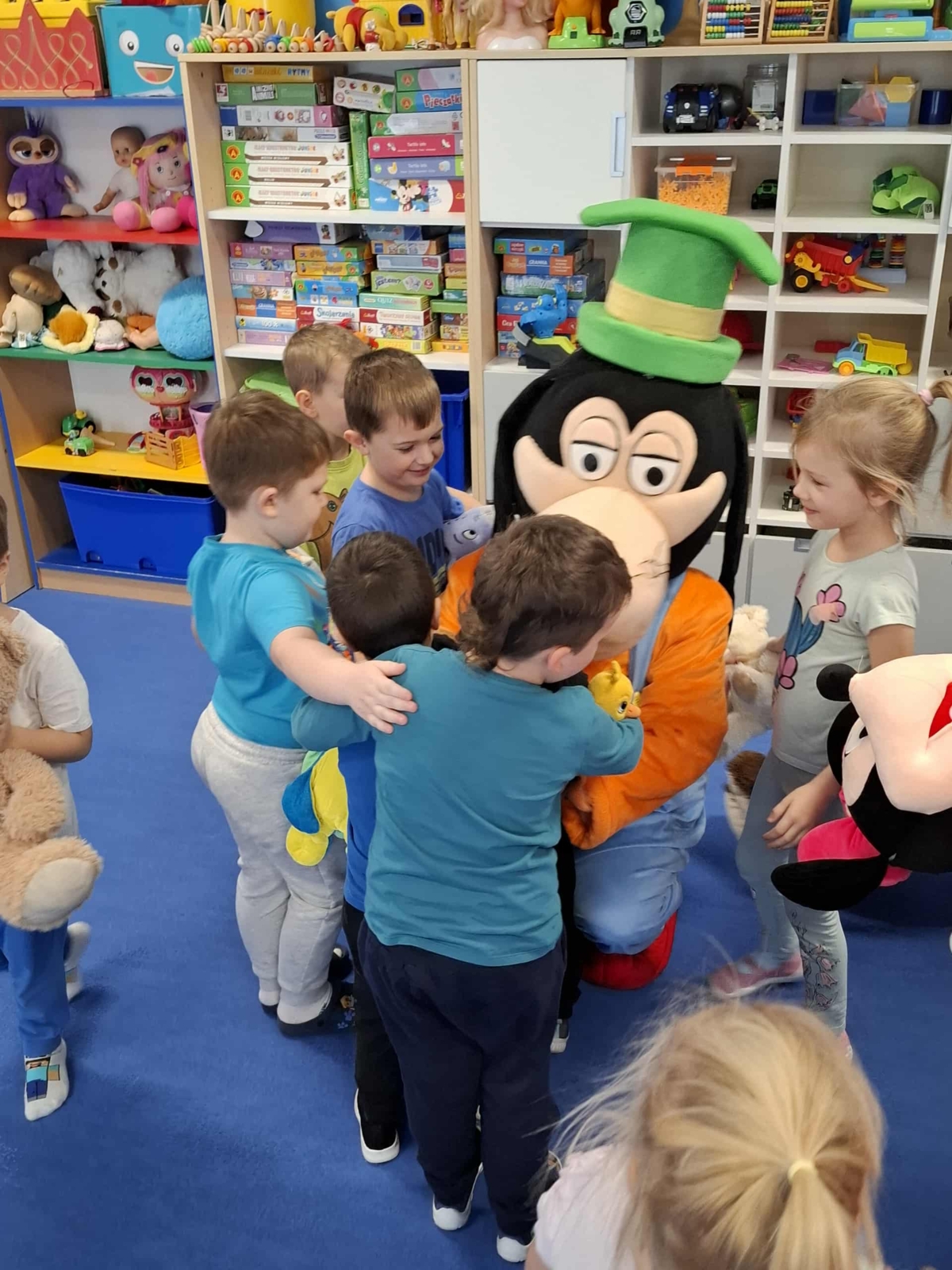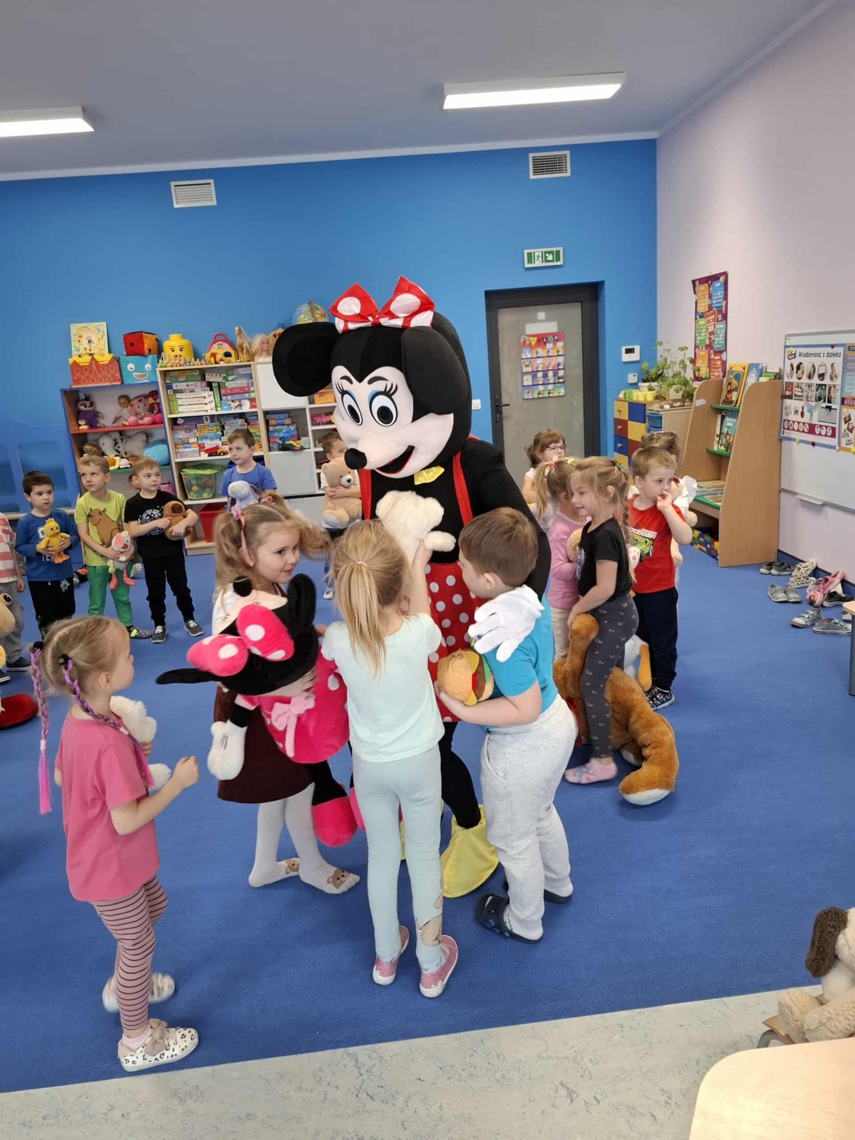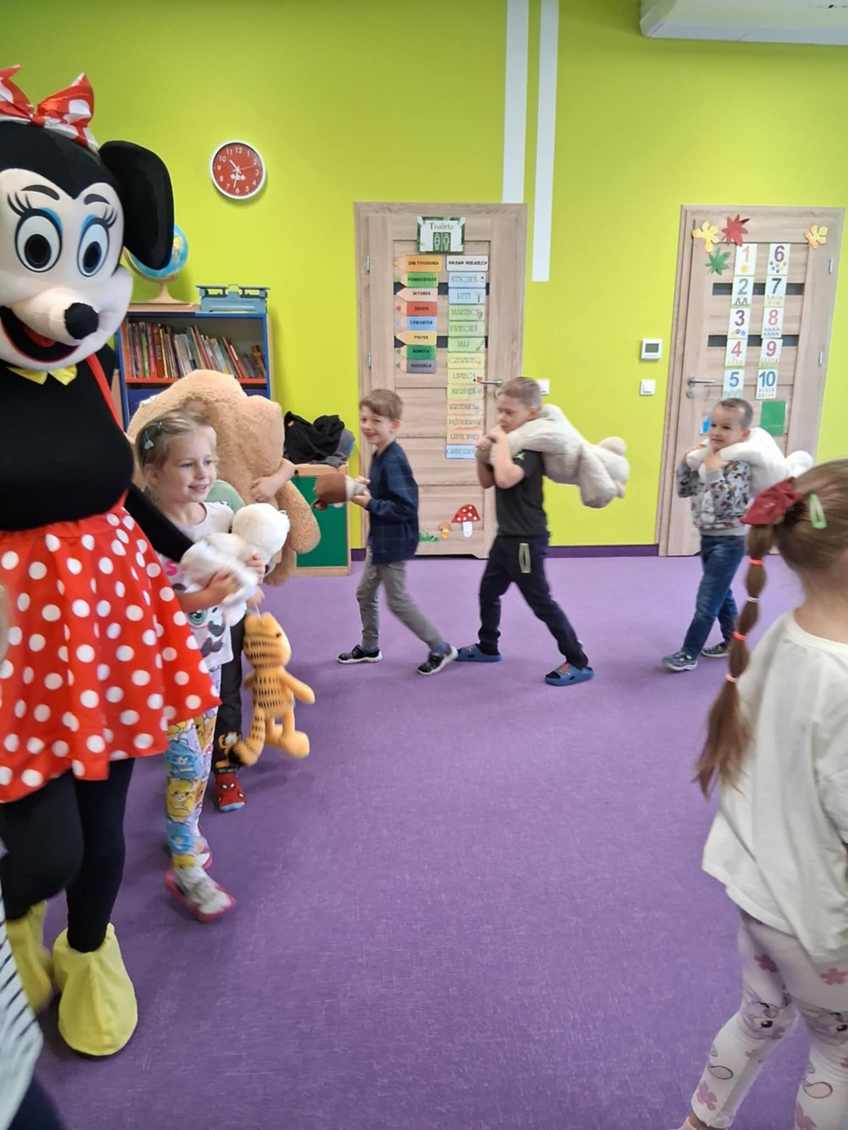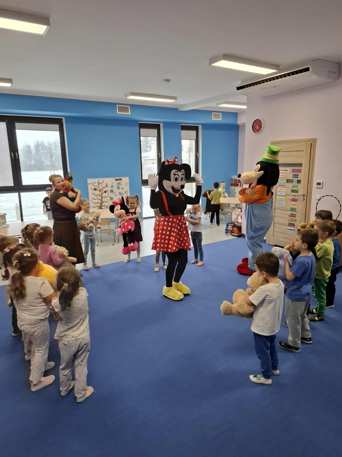 Dziś w naszym przedszkolu obchodziliśmy radosny Dzień Pluszowego Misia. Z tej okazji dzieci oraz panie przyniosły swoje ulubione pluszowe przytulanki, które towarzyszyły nam przez cały dzień. Niespodzianką była wizyta dwóch bajkowych maskotek – Goofiego i Myszki Miki, z którymi dzieci miały okazję wspólnie się pobawić. Bajkowe postacie swoją obecnością wywołały wielką radość u dzieci. Na zakończenie wizyty dzieciom zostały podarowane słodkie upominki.