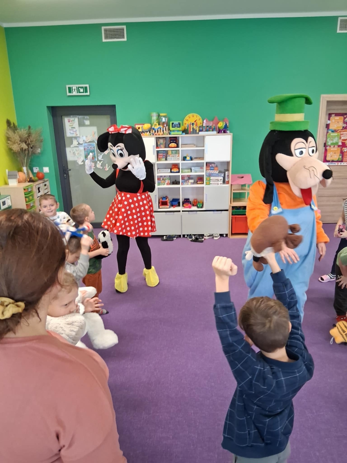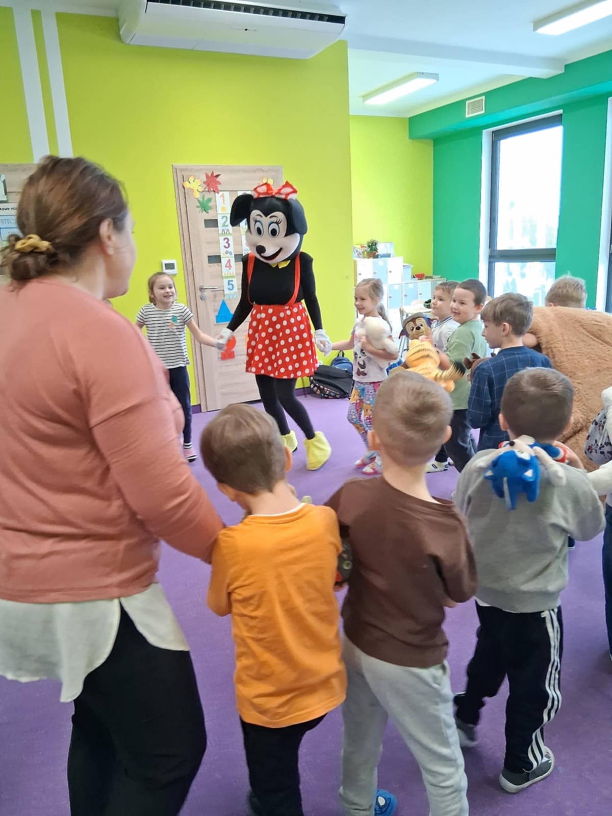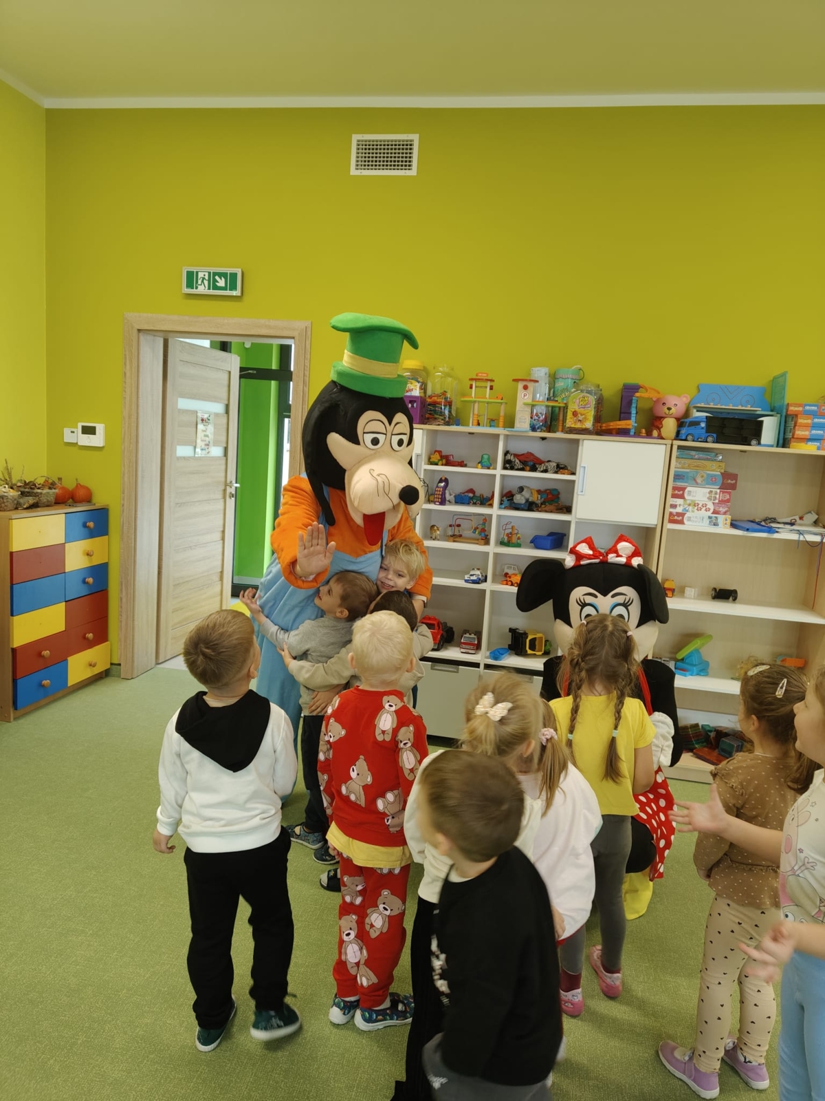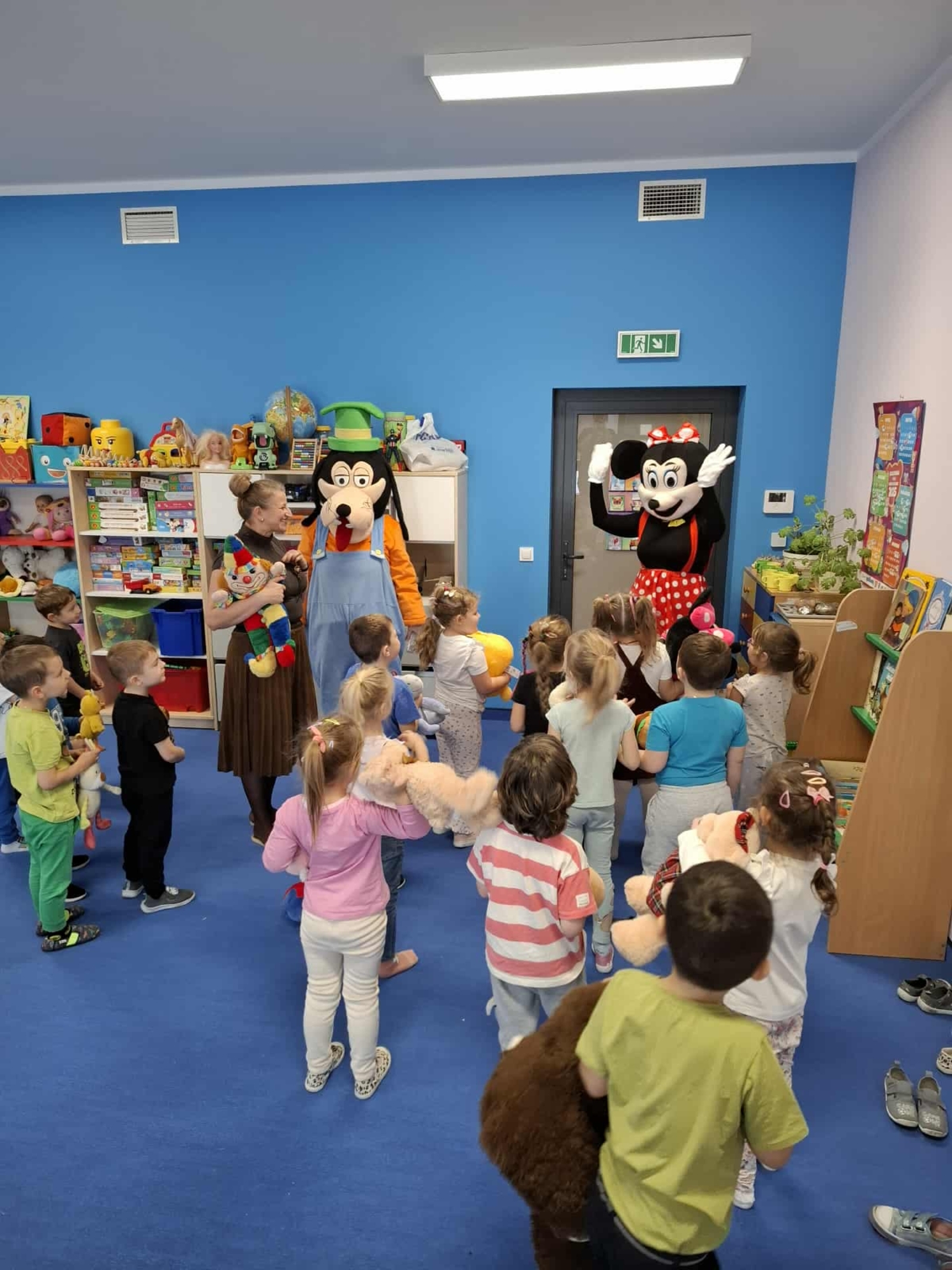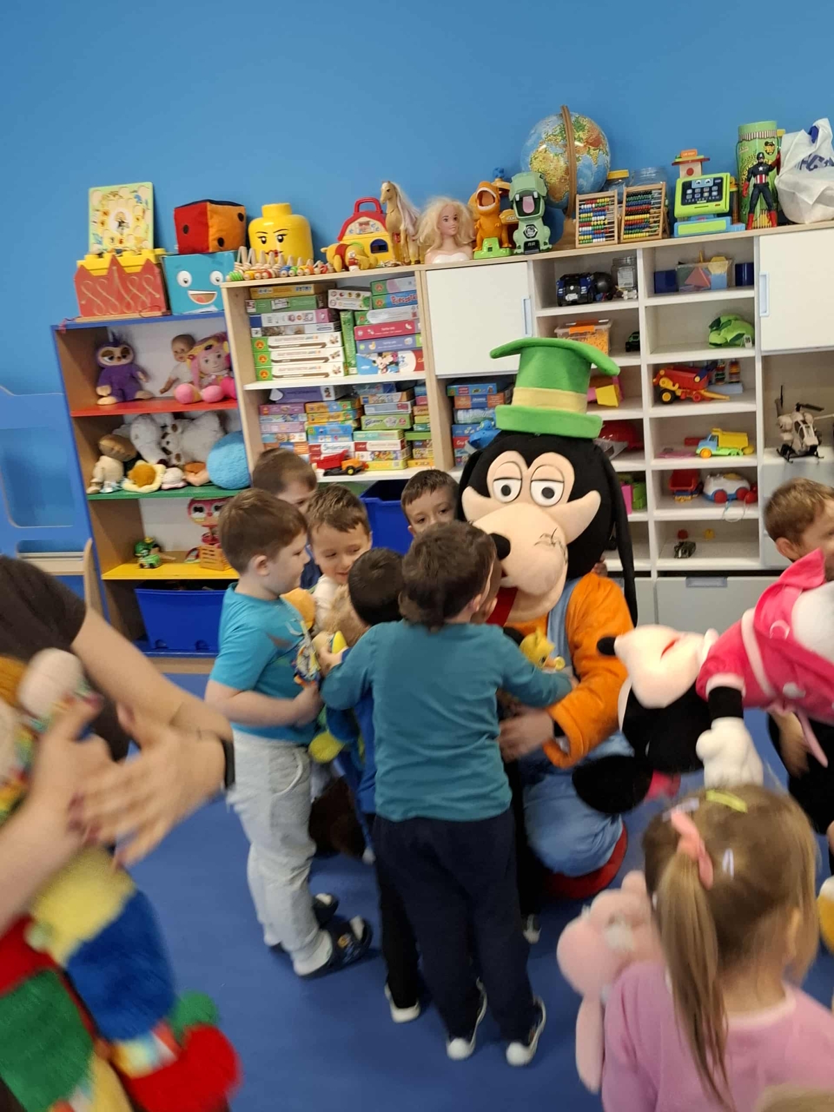 Dziś w naszym przedszkolu obchodziliśmy radosny Dzień Pluszowego Misia. Z tej okazji dzieci oraz panie przyniosły swoje ulubione pluszowe przytulanki, które towarzyszyły nam przez cały dzień. Niespodzianką była wizyta dwóch bajkowych maskotek – Goofiego i Myszki Miki, z którymi dzieci miały okazję wspólnie się pobawić. Bajkowe postacie swoją obecnością wywołały wielką radość u dzieci. Na zakończenie wizyty dzieciom zostały podarowane słodkie upominki.