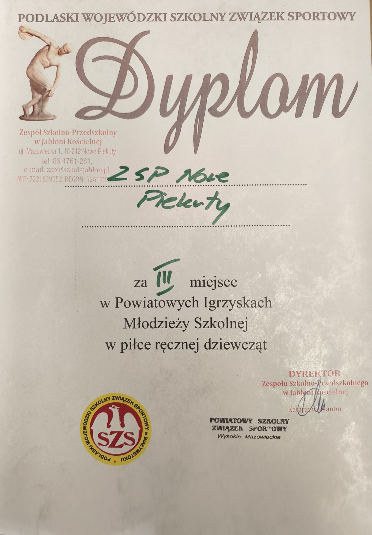 W dniu 20 lutego 2026 roku 13 uczennic reprezentowało naszą szkołę w Powiatowych Igrzyskach Młodzieży Szkolnej w piłce ręcznej dziewcząt, które odbyły się w Zespole Szkolno-Przedszkolnym w Jabłoni Kościelnej. Do rywalizacji przystąpiły najlepsze drużyny z powiatu. Nasze dziewczyny wywalczyły III miejsce. Gratulujemy i życzymy dalszych sukcesów!