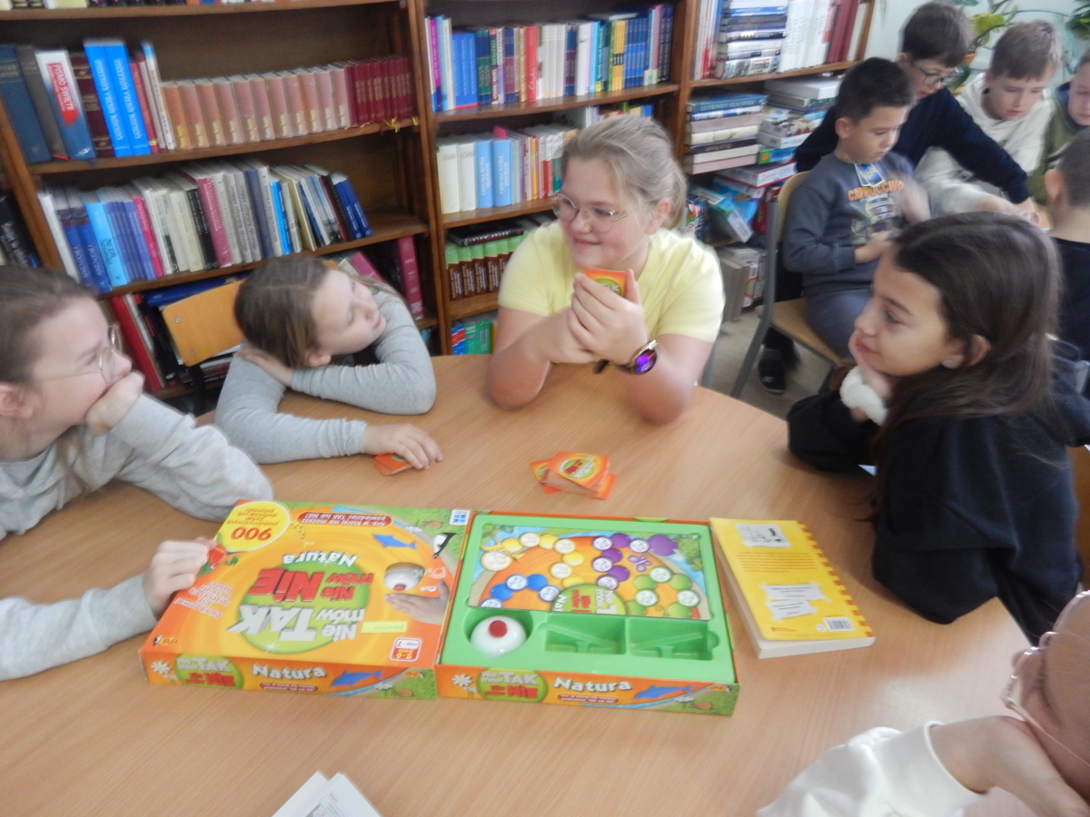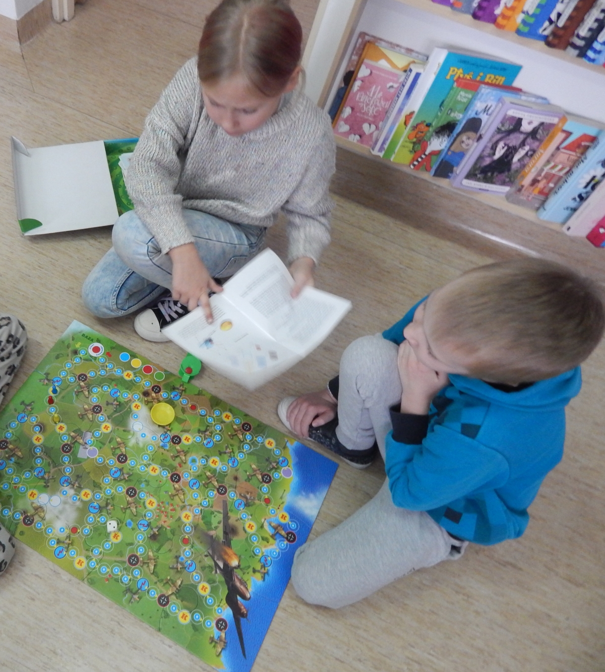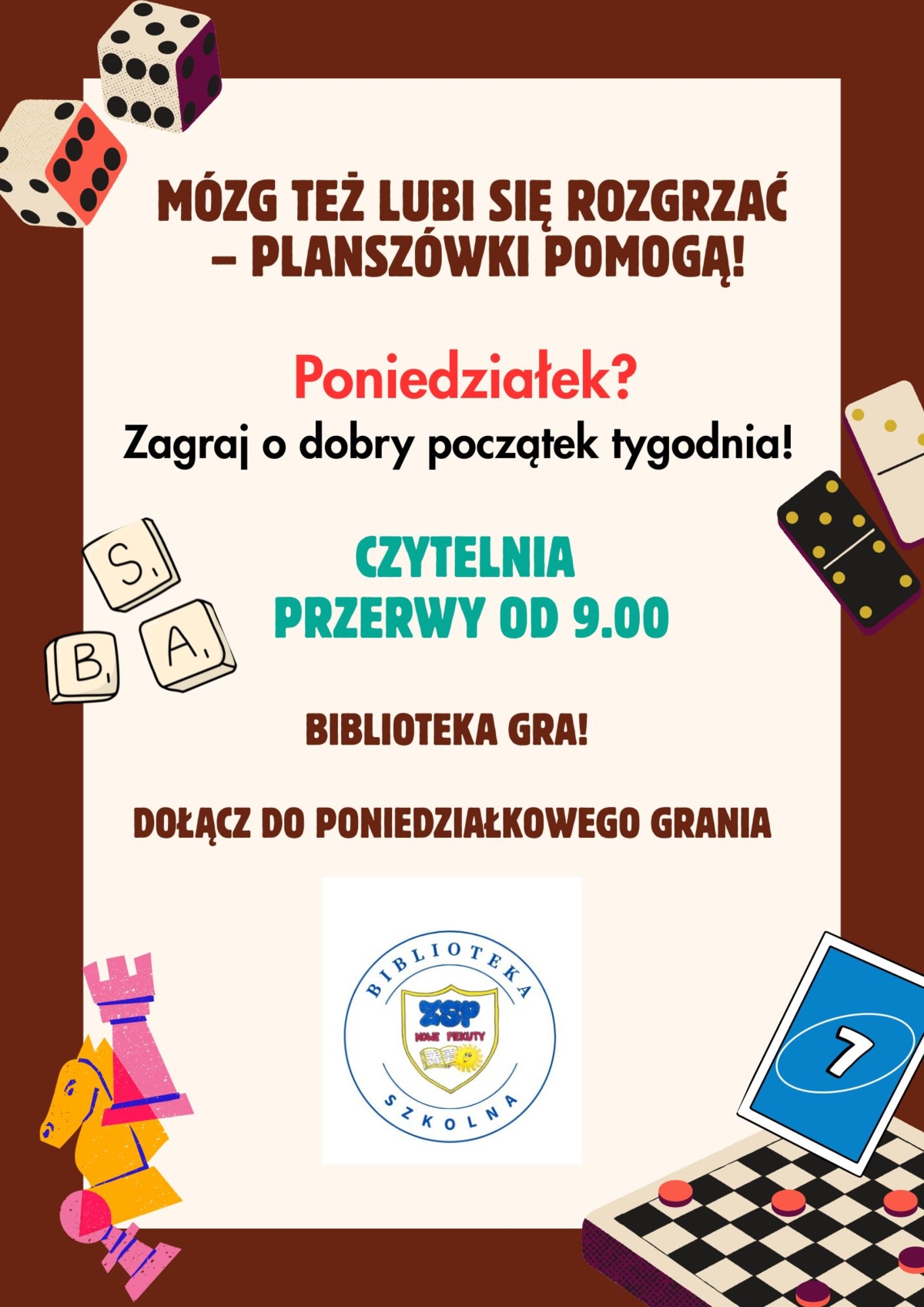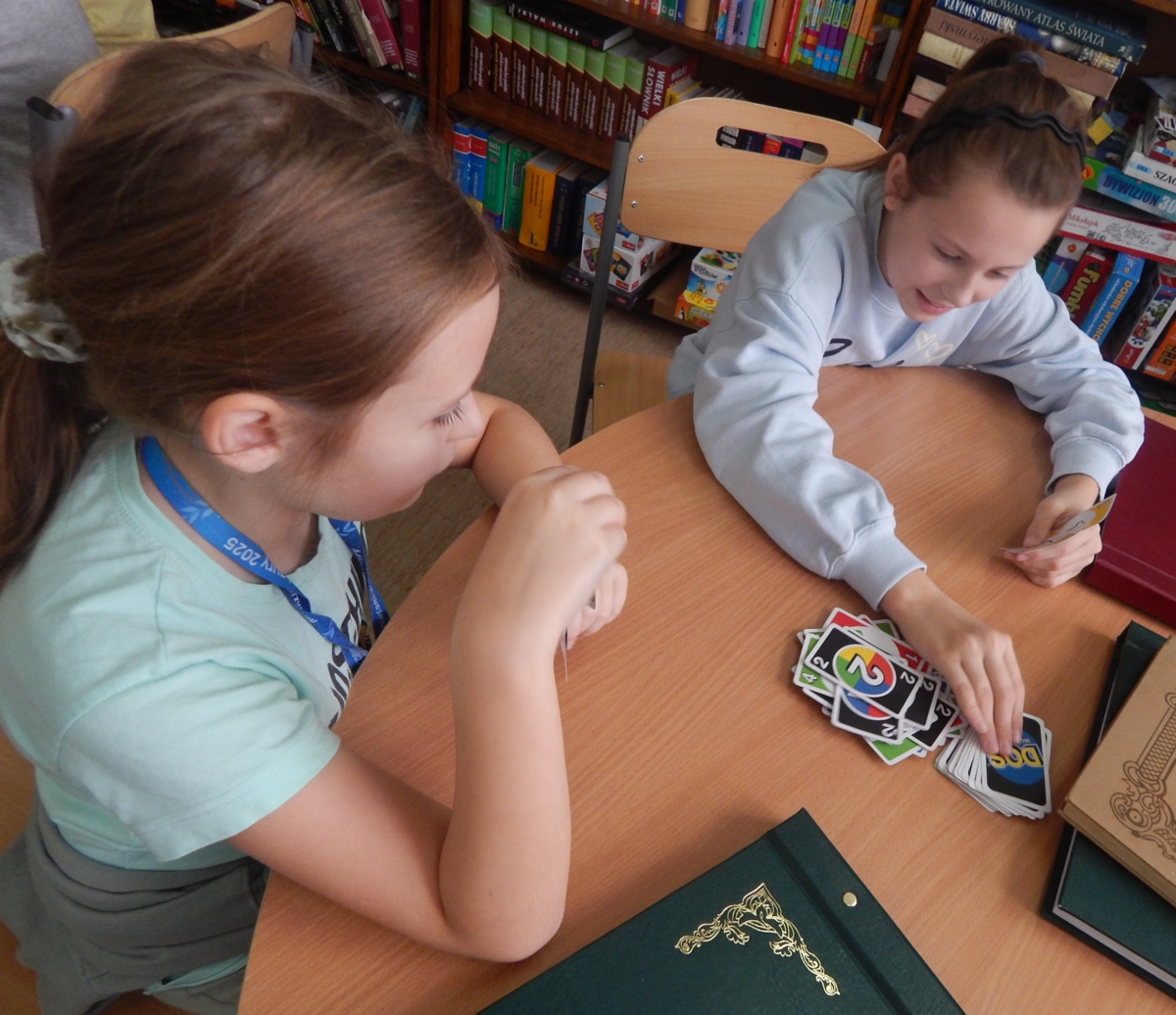 W naszej bibliotece od początku listopada funkcjonuje przestrzeń do grania w gry planszowe i karciane. Pomysł ten powstał z inicjatywy samych uczniów. W poniedziałki realizowana jest akcja „Zagraj o dobry początek tygodnia”, podczas której chętni uczniowie rozpoczynają tydzień krótką rozgrywką. Planszówki pełnią tu rolę „rozgrzewki” dla mózgu, wspierając koncentrację, kreatywność i współpracę… Granie w nie rozwija logiczne myślenie, uczy planowania i przewidywania, wzmacnia komunikację, a także pomaga trenować cierpliwość i radzenie sobie z emocjami. Natomiast, na co dzień w czytelni dostępne są szachy – królewska gra wymagająca ciszy, skupienia i strategicznego myślenia, dlatego stanowi ona stały element bibliotecznej strefy ciszy. Ta uczniowska inicjatywa doskonale wpisuje się w ideę biblioteki, jako miejsca wszechstronnego rozwoju i twórczej aktywności.