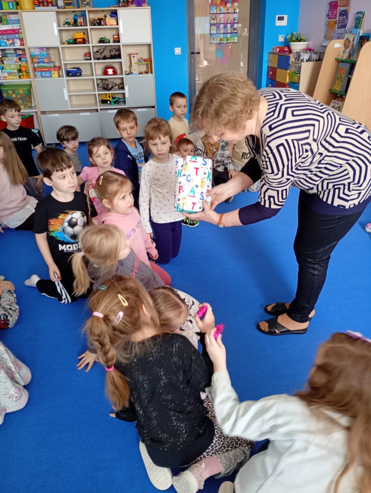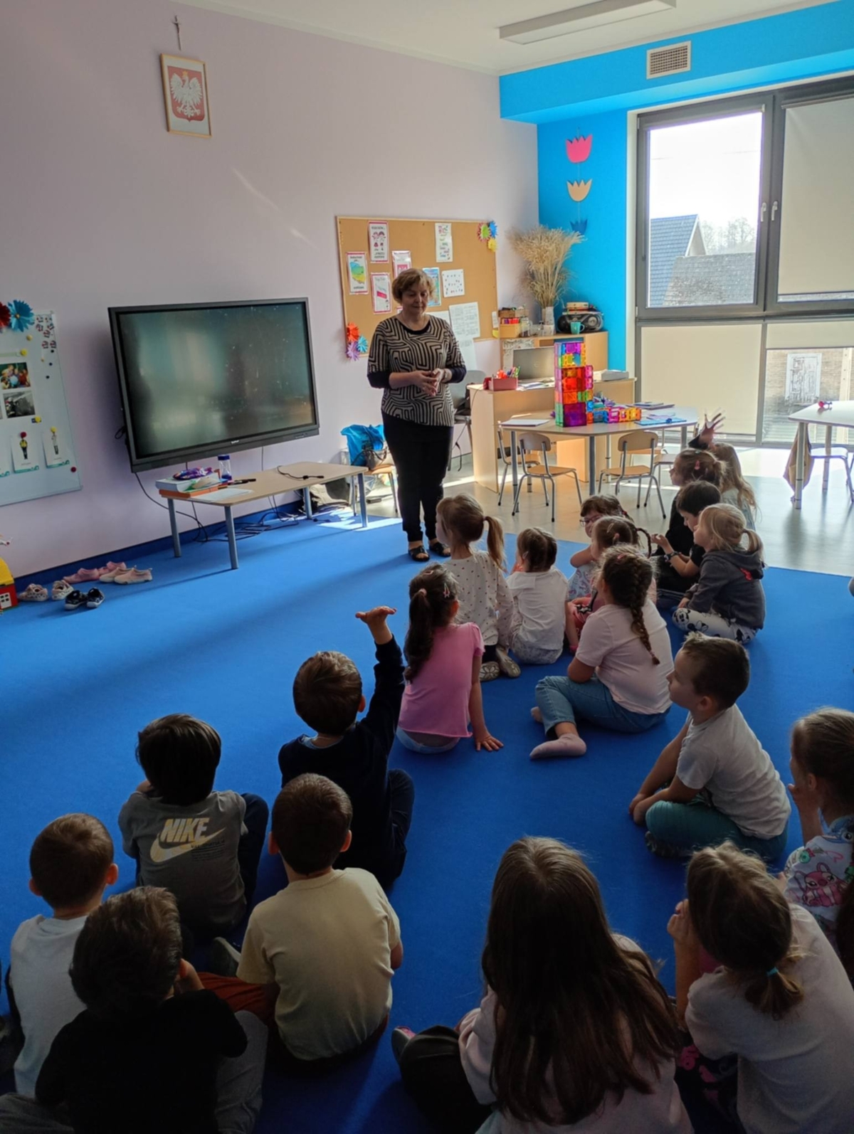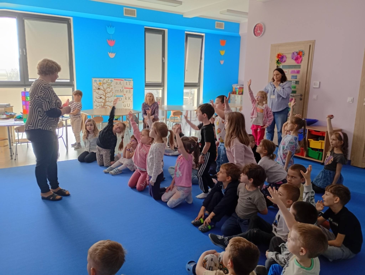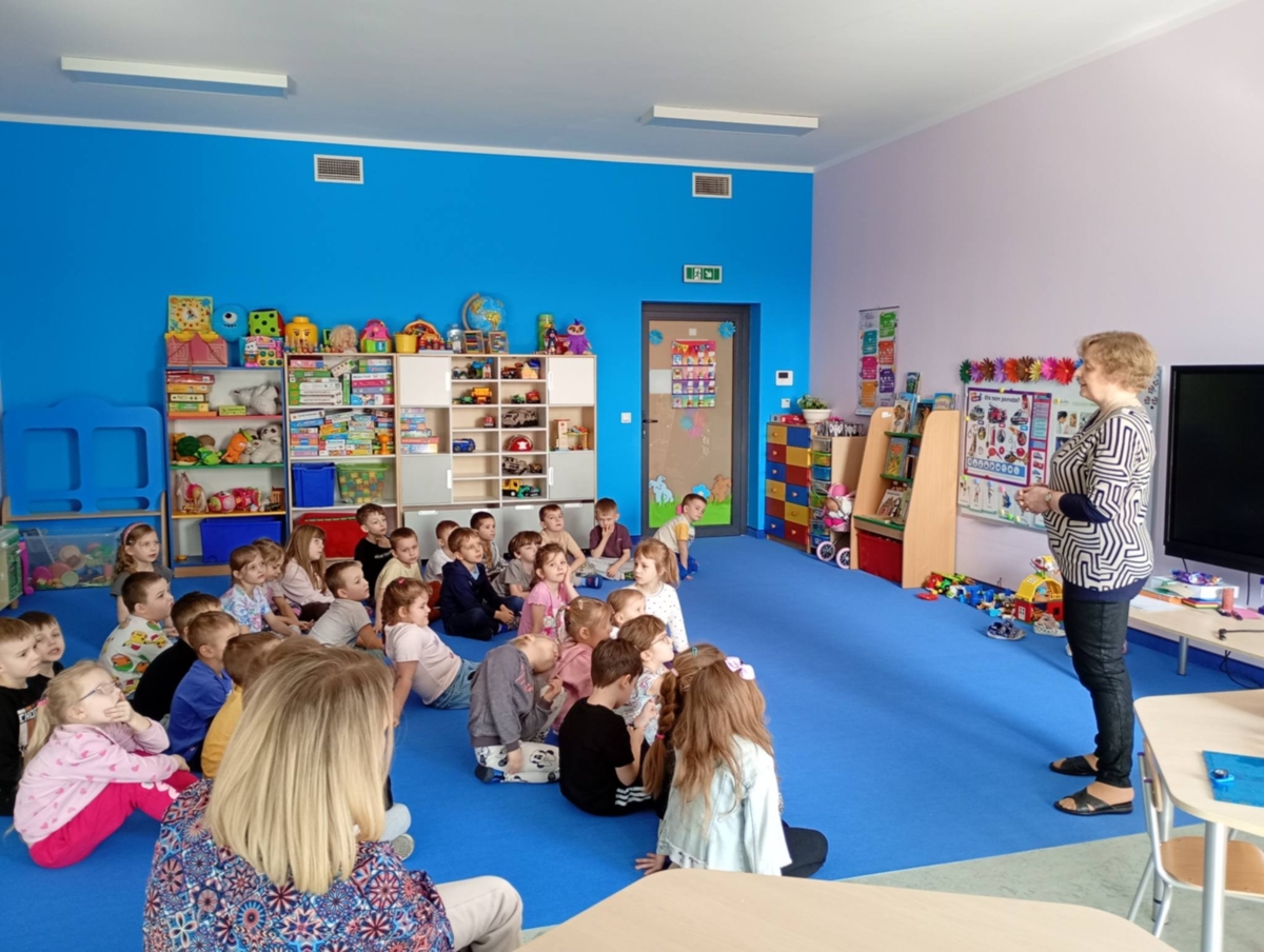 W czwartek 12 marca, w ramach tygodnia o zawodach w grupie 5-latków i 6-latków gościła z wizytą Pani Regina Szymborska – emerytowana nauczycielka matematyki. W bardzo ciekawy i przystępny sposób przybliżyła przedszkolakom, na czym polega praca nauczyciela oraz jakie obowiązki i radości wiążą się z wykonywaniem tego zawodu. Podczas spotkania dzieci aktywnie uczestniczyły w rozmowie, odpowiadały na pytania oraz rozwiązywały przygotowane zagadki. Nie zabrakło również prostych działań matematycznych, które sprawiły dzieciom dużo radości i były okazją do wspólnej zabawy i nauki. Na zakończenie spotkania, wszystkie dzieci otrzymały od Pani Reginy słodki podarunek, a w ramach podziękowania za wizytę i ciekawe zajęcia obdarowały swojego gościa drobnym upominkiem.