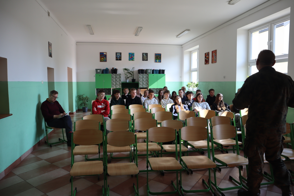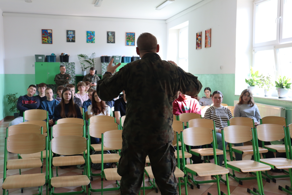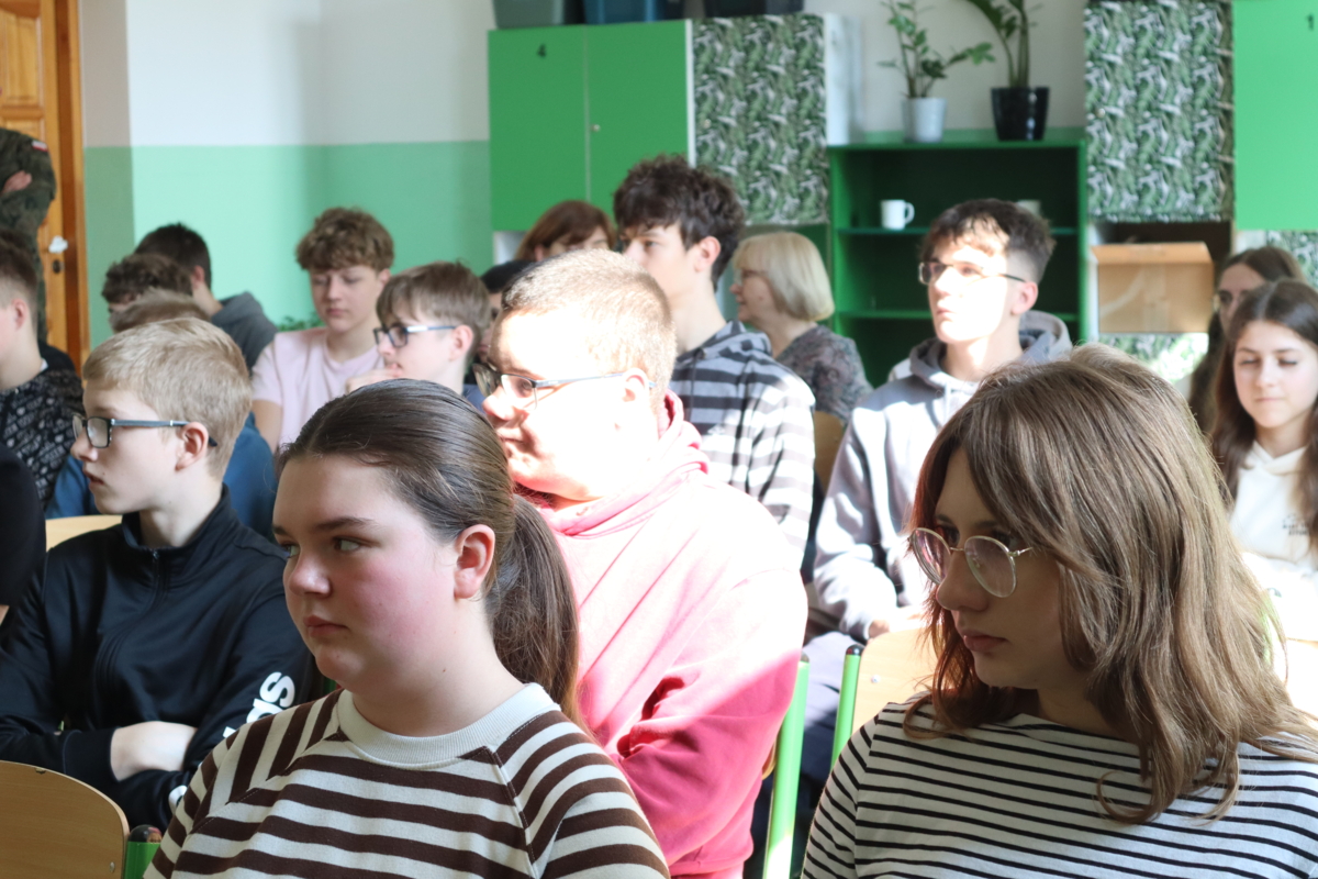 19 marca do naszej szkoły przyjechali żołnierze z 18 Białostockiego Pułku Rozpoznawczego. Zorganizowali lekcję dla uczniów klas siódmych, a później ósmych. Prowadzący zajęcia zaczął od omówienia zjawiska cyberprzemocy i hejtu wśród młodzieży. Podkreślił, jak ważne jest budowanie właściwych relacji, rozmawianie z innymi, stawianie sobie wymagań. Powiedział też, że trzeba zdawać sobie sprawę, co chcemy w życiu robić, że warto mieć pasję. Mówił także o służbie w wojsku, jaka to jest praca. Pytał, czy ktoś z uczniów myśli o wyborze takiego zawodu.