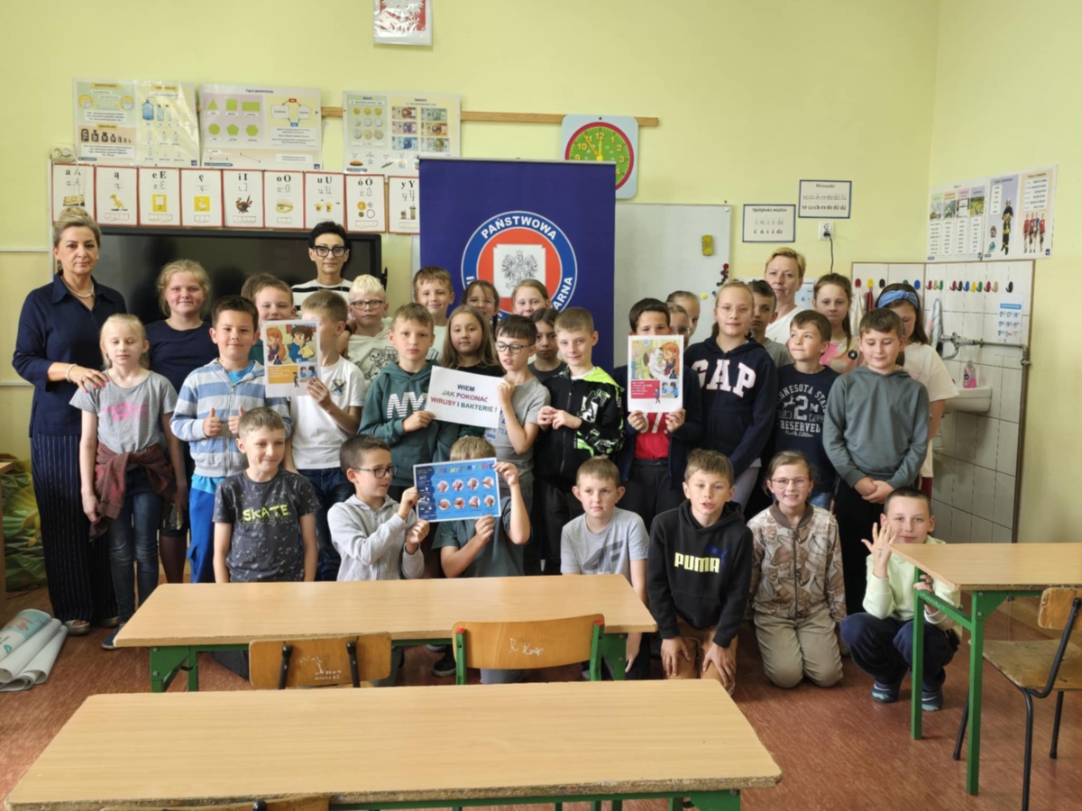 Dnia 11.06.2025 roku uczniowie klas 3 uczestniczyli w spotkaniu z pracownicami sanepidu, podczas którego odbyły się warsztaty edukacyjne na temat higieny i zdrowia. Podczas spotkania panie z sanepidu opowiadały o znaczeniu mycia rąk, wyjaśniały, jak wirusy i bakterie mogą się rozprzestrzeniać oraz jak się przed nimi chronić. Uczniowie dowiedzieli się, że regularne i dokładne mycie rąk jest kluczowe w zapobieganiu chorobom. Dzieci miały także okazję obejrzeć swoje ręce pod specjalną lampą UV, co pokazało, jak wiele brudu i bakterii może się na nich znajdować, nawet jeśli nie widać tego gołym okiem. Ponadto poruszono temat kleszczy i wścieklizny. Panie mówiły o tym, jak ważne jest unikanie kontaktu z kleszczami podczas spacerów na dworze, jak ubrać się na taki spacer oraz co robić, gdy znajdziemy kleszcza na ciele. Omówiono również objawy wścieklizny i jak ważne jest szybkie zgłoszenie się do lekarza w przypadku ukąszenia przez chore zwierzę. Na zakończenie uczniowie mieli okazję zadawać pytania i dowiedzieć się, jak dbać o swoje zdrowie na co dzień. Warsztaty bardzo podobały się dzieciom, a panie obiecały kolejne w nowym roku szkolnym.