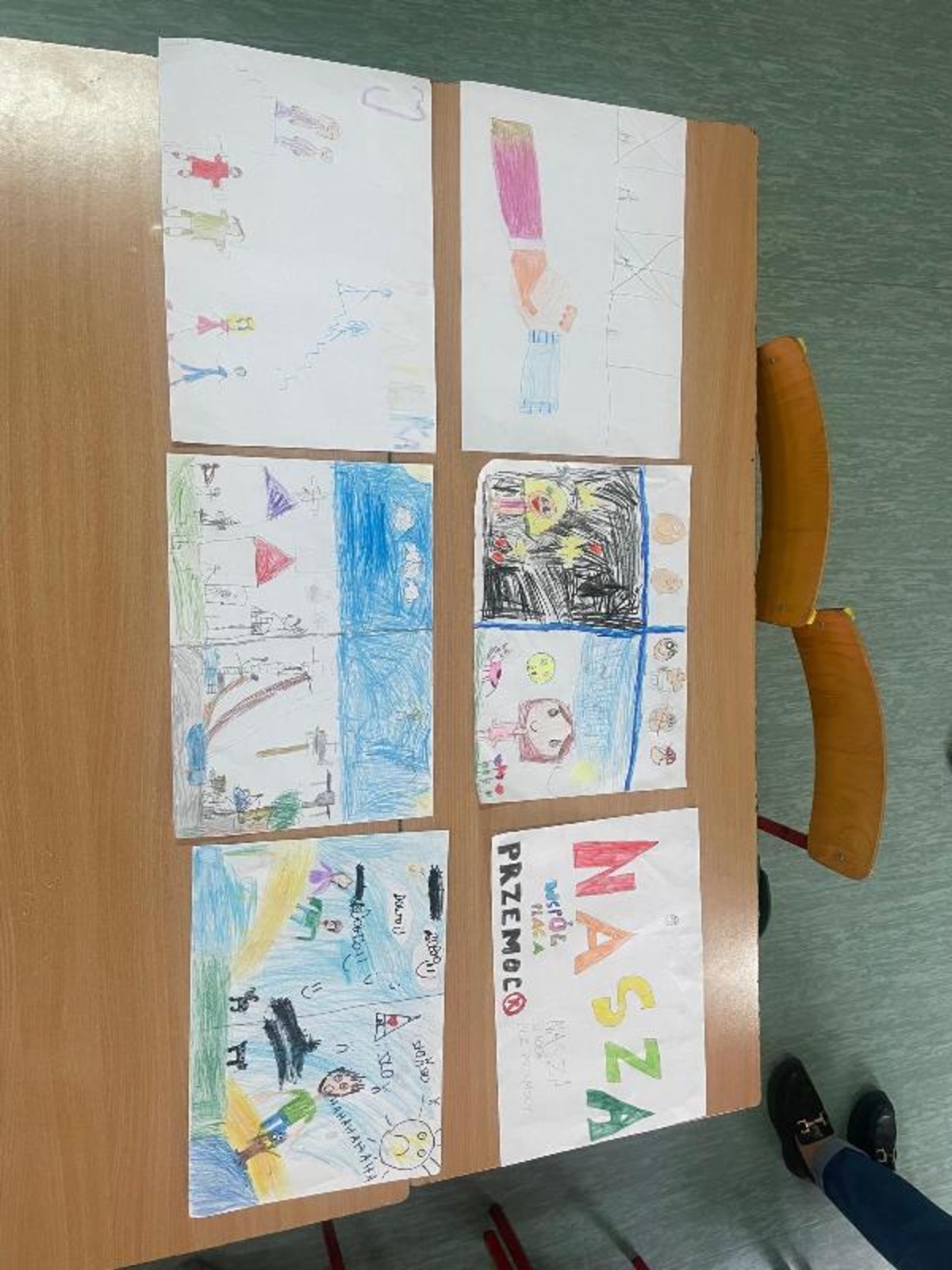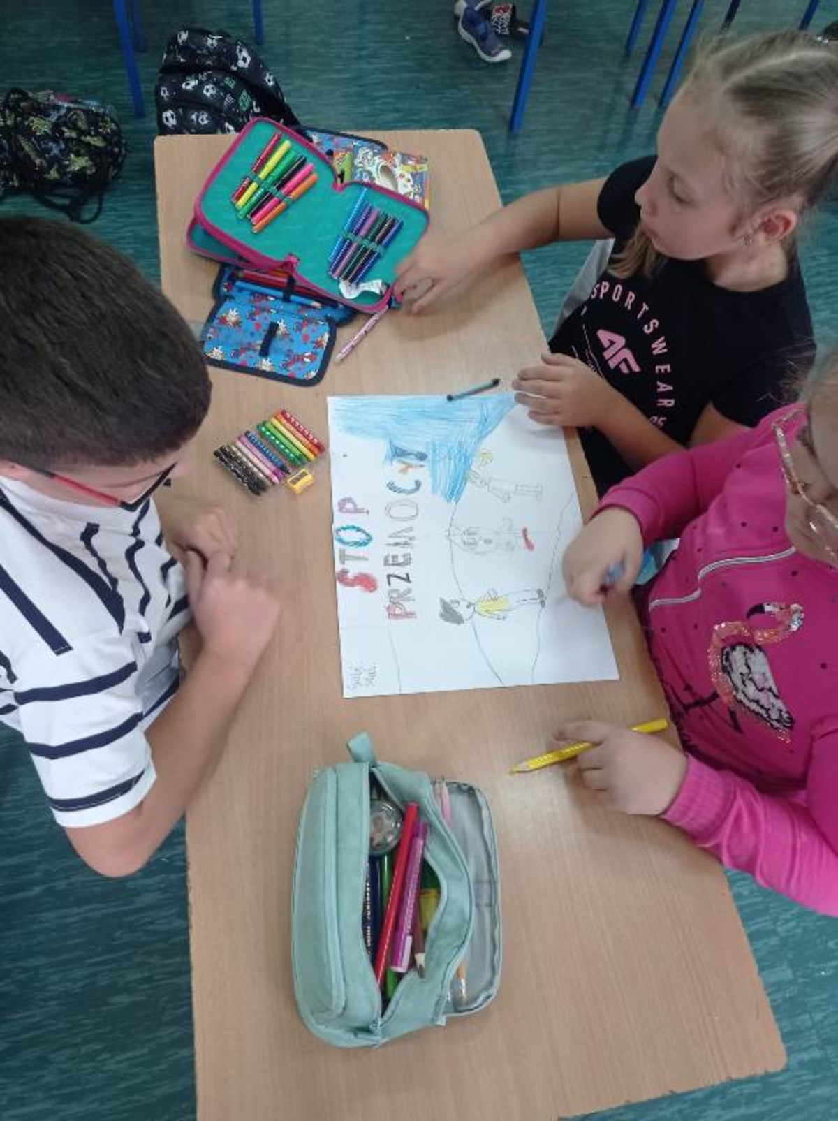 Wspólnym podsumowaniem cyklu lekcji we wszystkich klasach było wykonanie w grupach plakatów z hasłem „Stop przemocy!”. Dzięki podjętym działaniom wszyscy uczniowie utwierdzili się w przekonaniu, że nawet drobne gesty życzliwości i wsparcia mają realną siłę i pomagają tworzyć przyjazną atmosferę wolną od agresji.