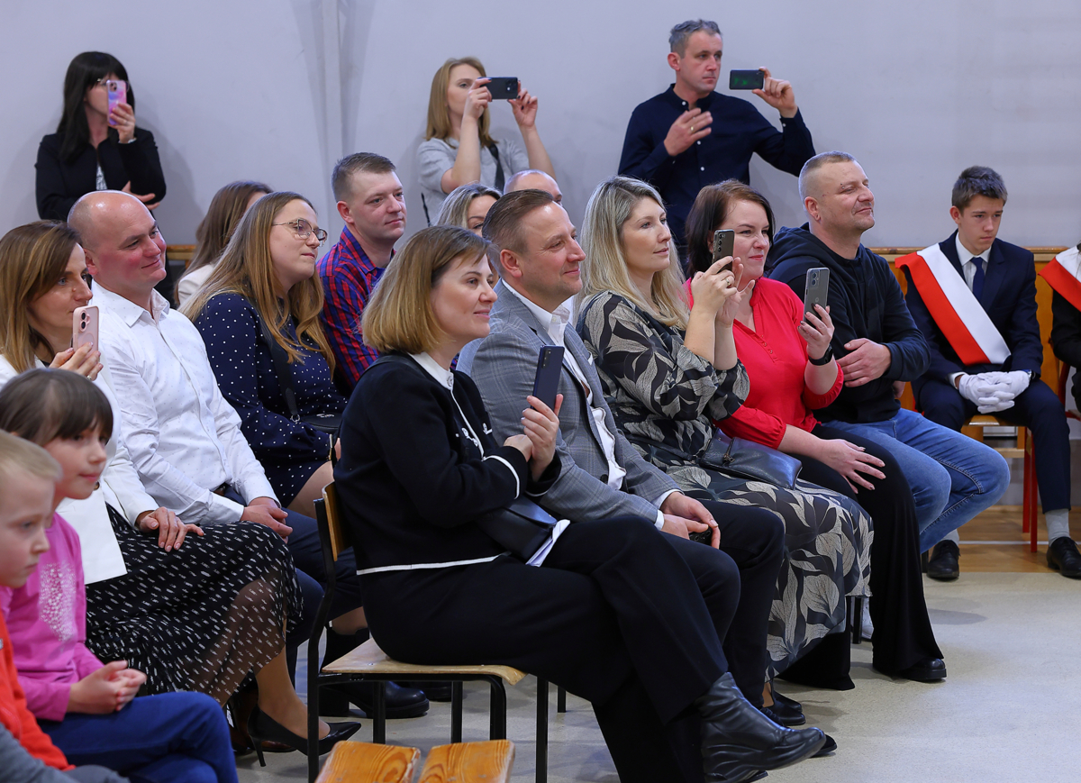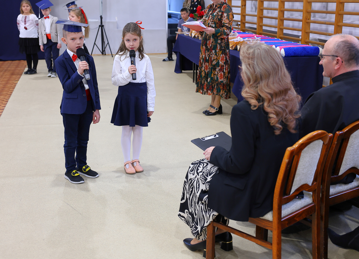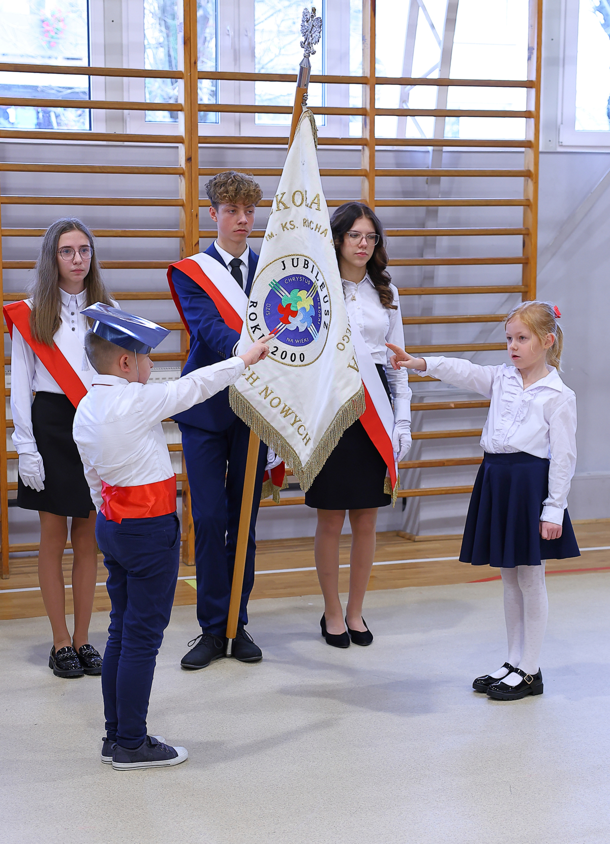 Uroczystość ślubowania pierwszoklasistów była nie tylko ważnym wydarzeniem dla najmłodszych uczniów, ale również piękną lekcją patriotyzmu i przywiązania do tradycji. W czasie ceremonii nawiązano do wartości, które są fundamentem pracy wychowawczej szkoły, a także do słów patrona – księdza Rocha Modzelewskiego, który przypominał: „Cokolwiek się wydarzy, nie wolno nam wyrzec się polskości.” Te słowa stały się mottem uroczystości, podkreślając, jak ważne jest pielęgnowanie miłości do Ojczyzny, szacunku dla historii i odpowiedzialności za przyszłość naszego kraju.