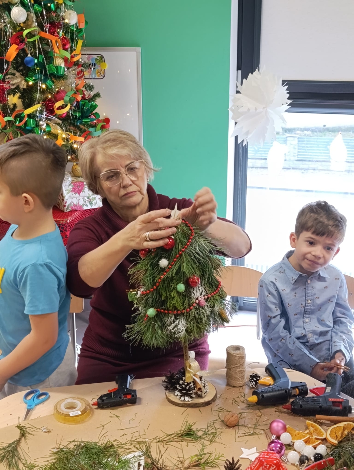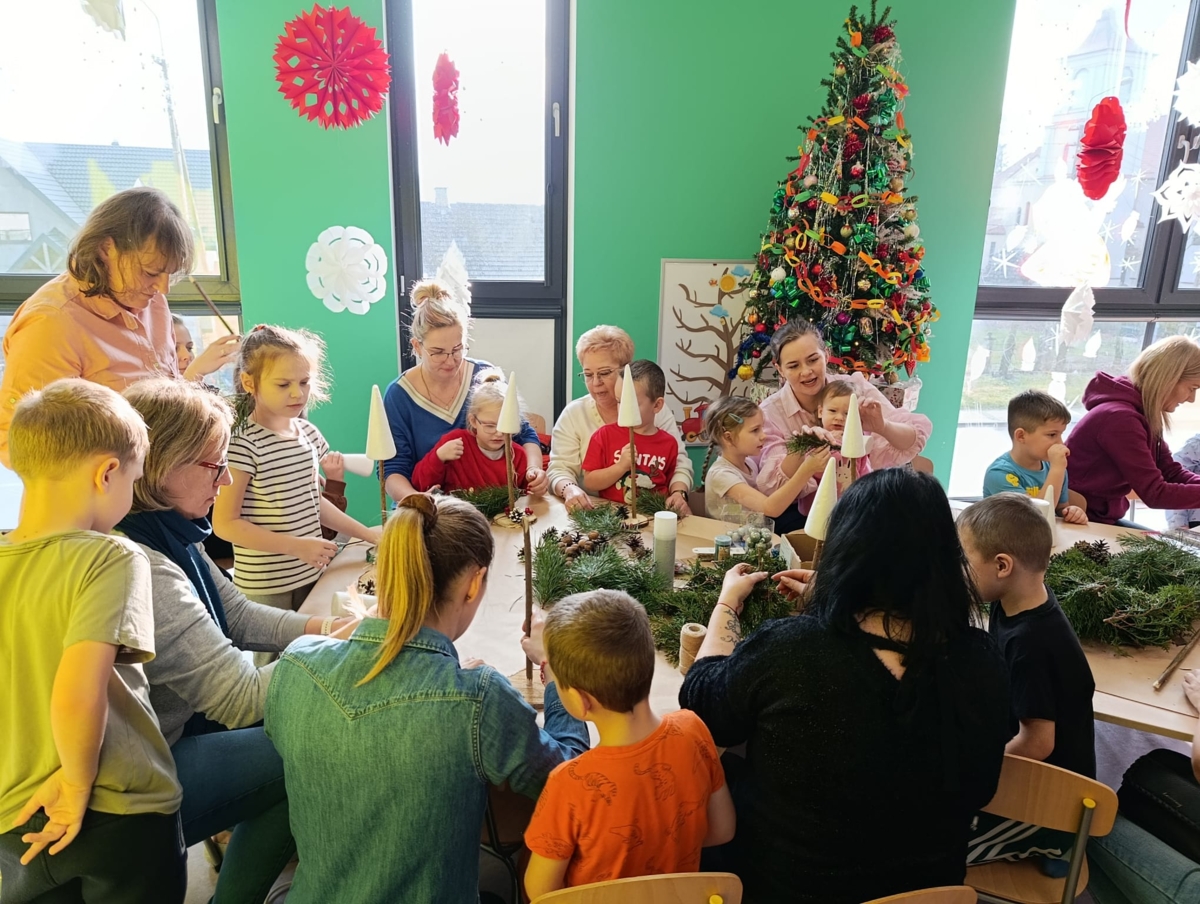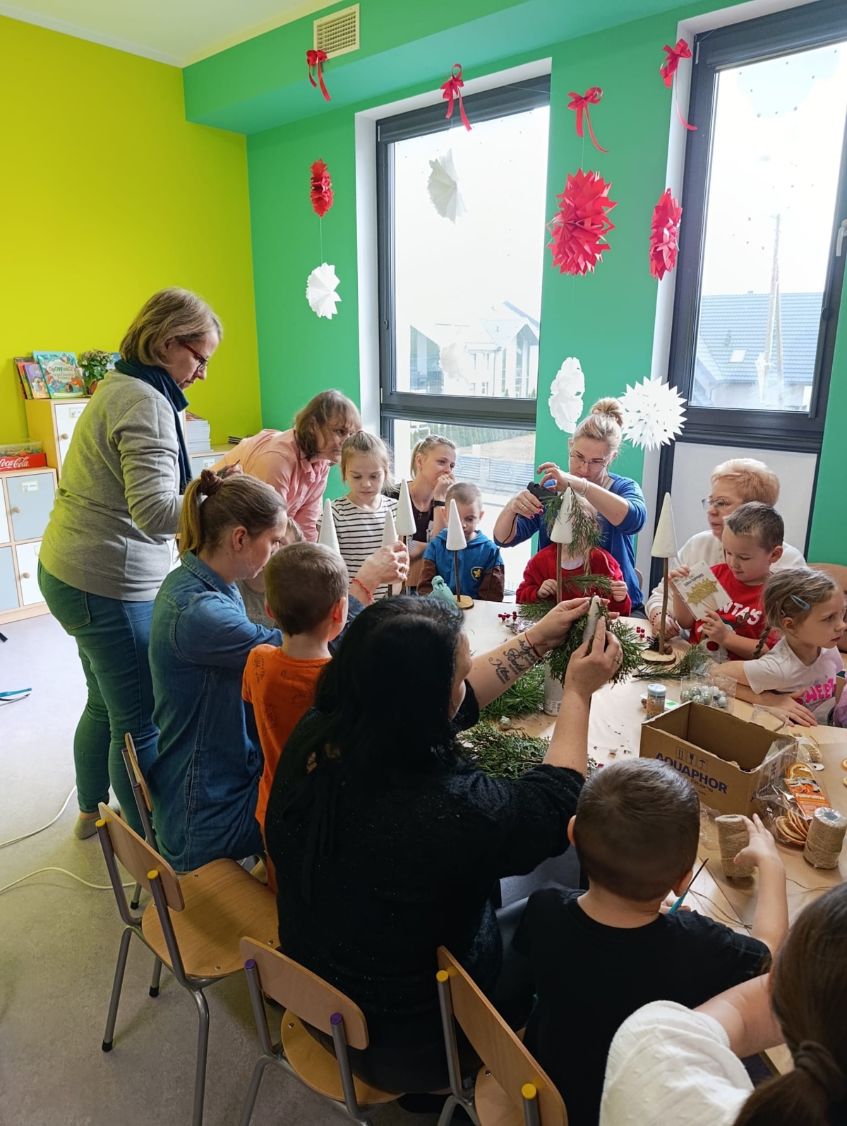 Podczas warsztatów dzieci, przy wsparciu rodziców wykonywały stroiki. Zajęciom towarzyszyła miła, świąteczna atmosfera, a w tle rozbrzmiewały kolędy i piosenki bożonarodzeniowe. Dzieci chętnie i z dużym zaangażowaniem uczestniczyły w proponowanych aktywnościach, rozwijając swoją kreatywność i zdolności manualne.