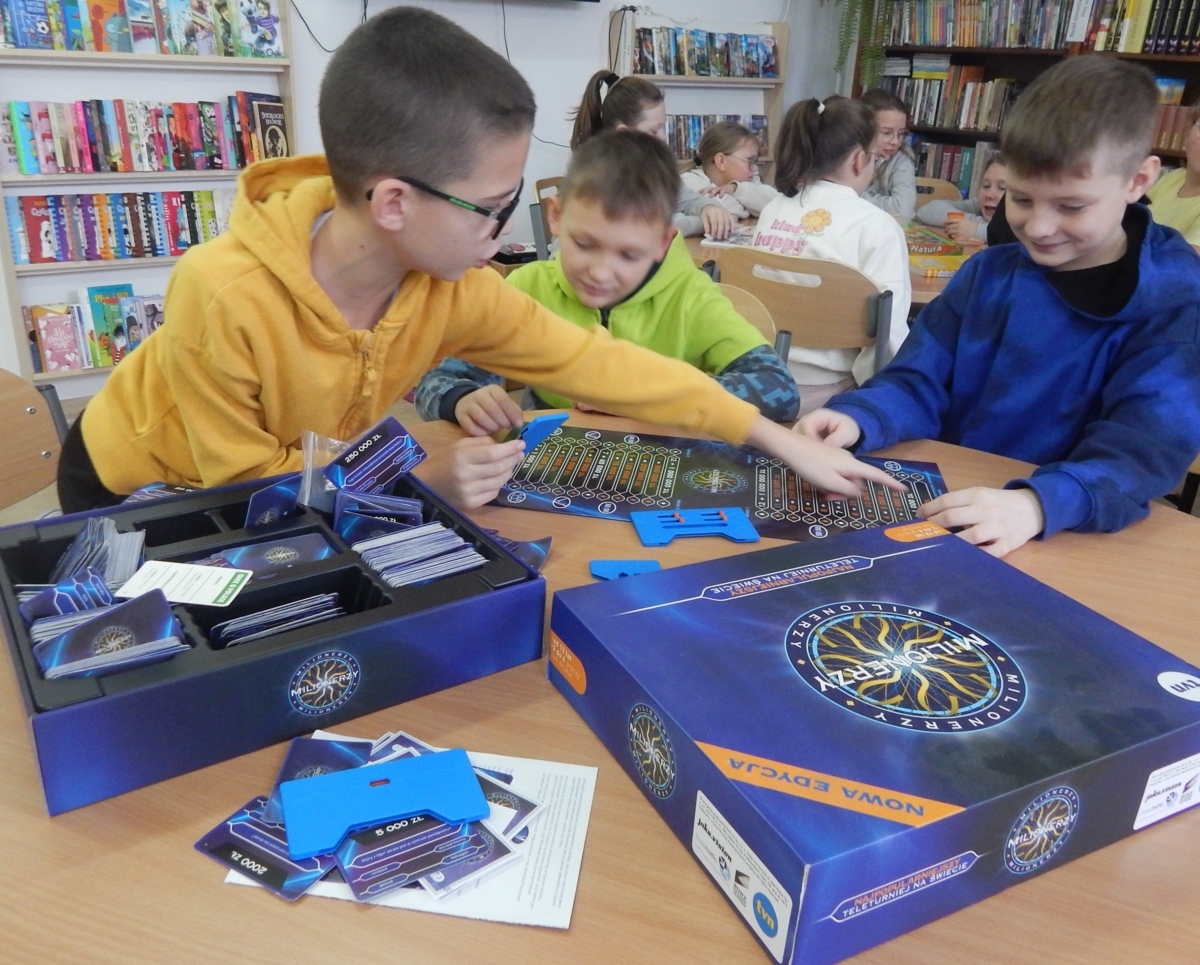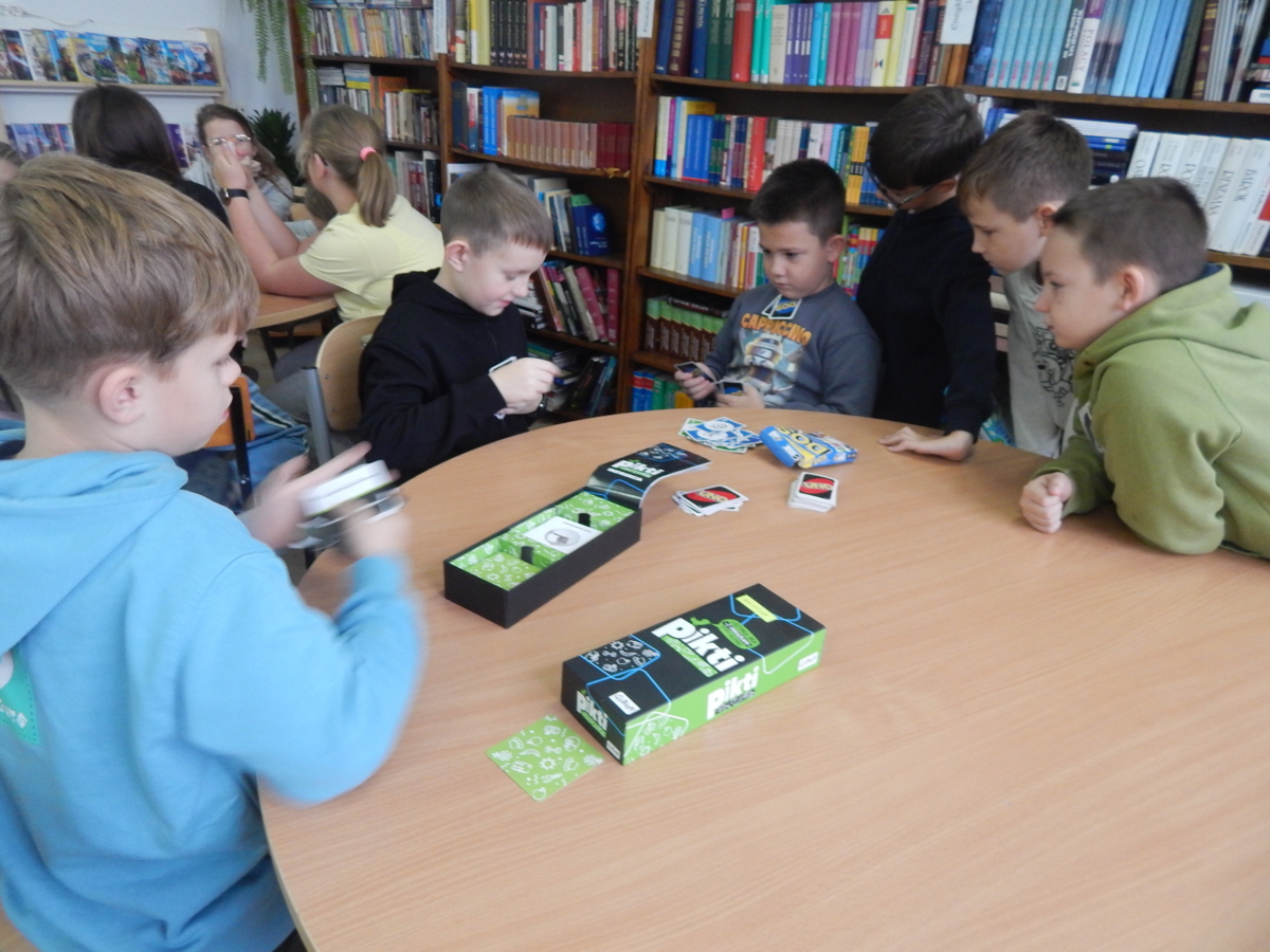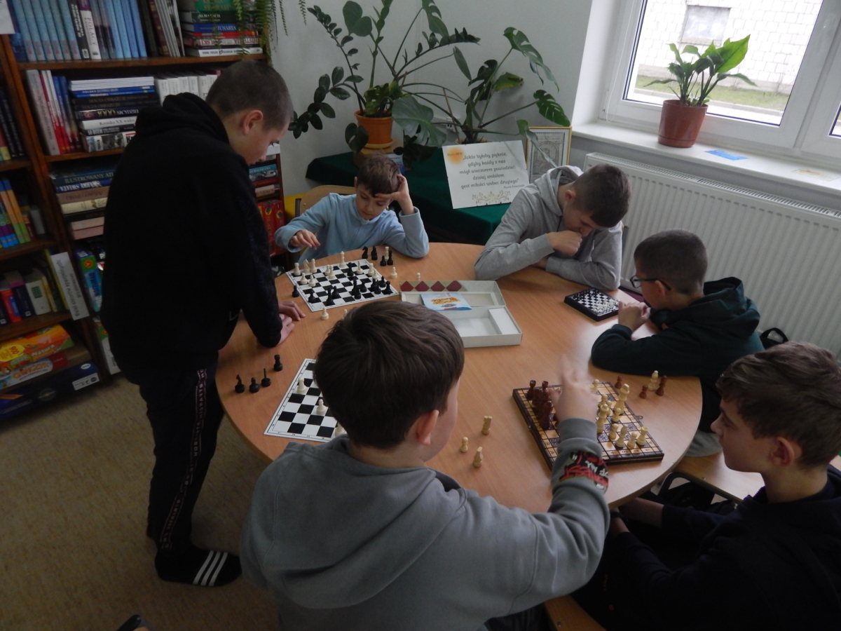 W naszej bibliotece od początku listopada funkcjonuje przestrzeń do grania w gry planszowe i karciane. Pomysł ten powstał z inicjatywy samych uczniów. W poniedziałki realizowana jest akcja „Zagraj o dobry początek tygodnia”, podczas której chętni uczniowie rozpoczynają tydzień krótką rozgrywką. Planszówki pełnią tu rolę „rozgrzewki” dla mózgu, wspierając koncentrację, kreatywność i współpracę… Granie w nie rozwija logiczne myślenie, uczy planowania i przewidywania, wzmacnia komunikację, a także pomaga trenować cierpliwość i radzenie sobie z emocjami. Natomiast, na co dzień w czytelni dostępne są szachy – królewska gra wymagająca ciszy, skupienia i strategicznego myślenia, dlatego stanowi ona stały element bibliotecznej strefy ciszy. Ta uczniowska inicjatywa doskonale wpisuje się w ideę biblioteki, jako miejsca wszechstronnego rozwoju i twórczej aktywności.