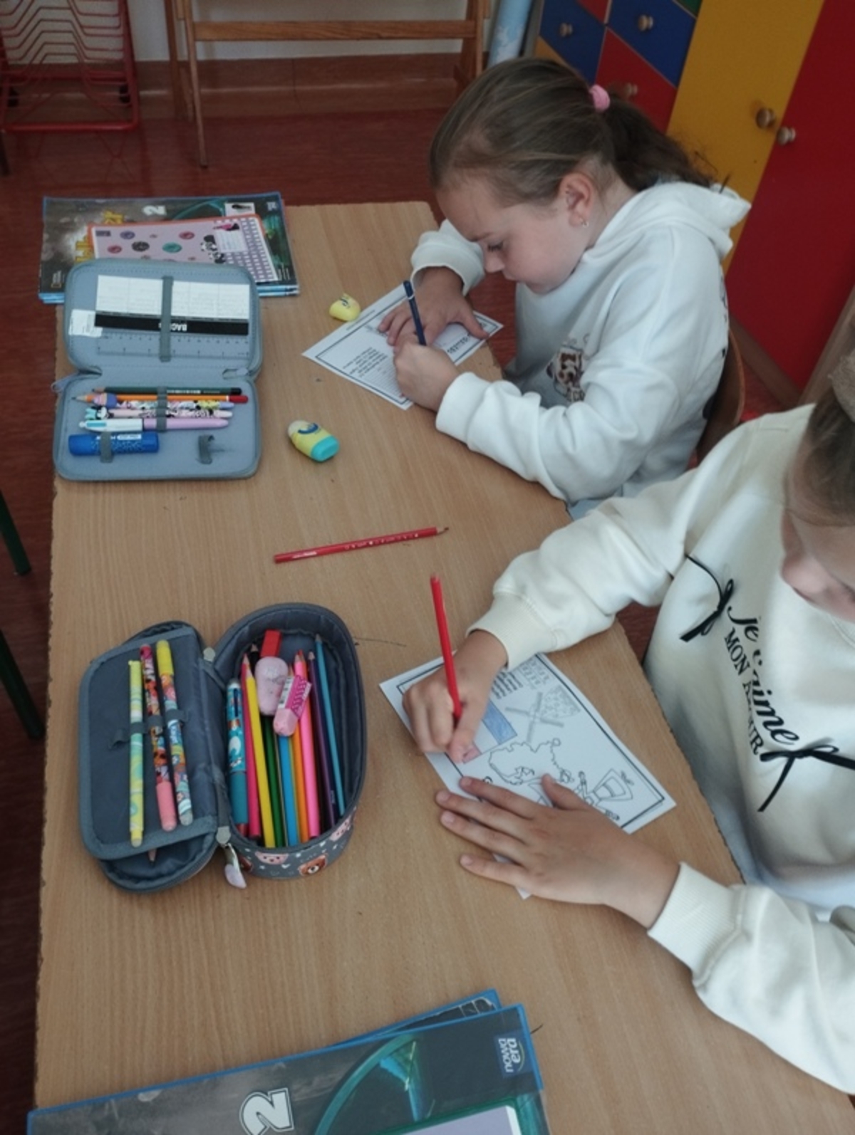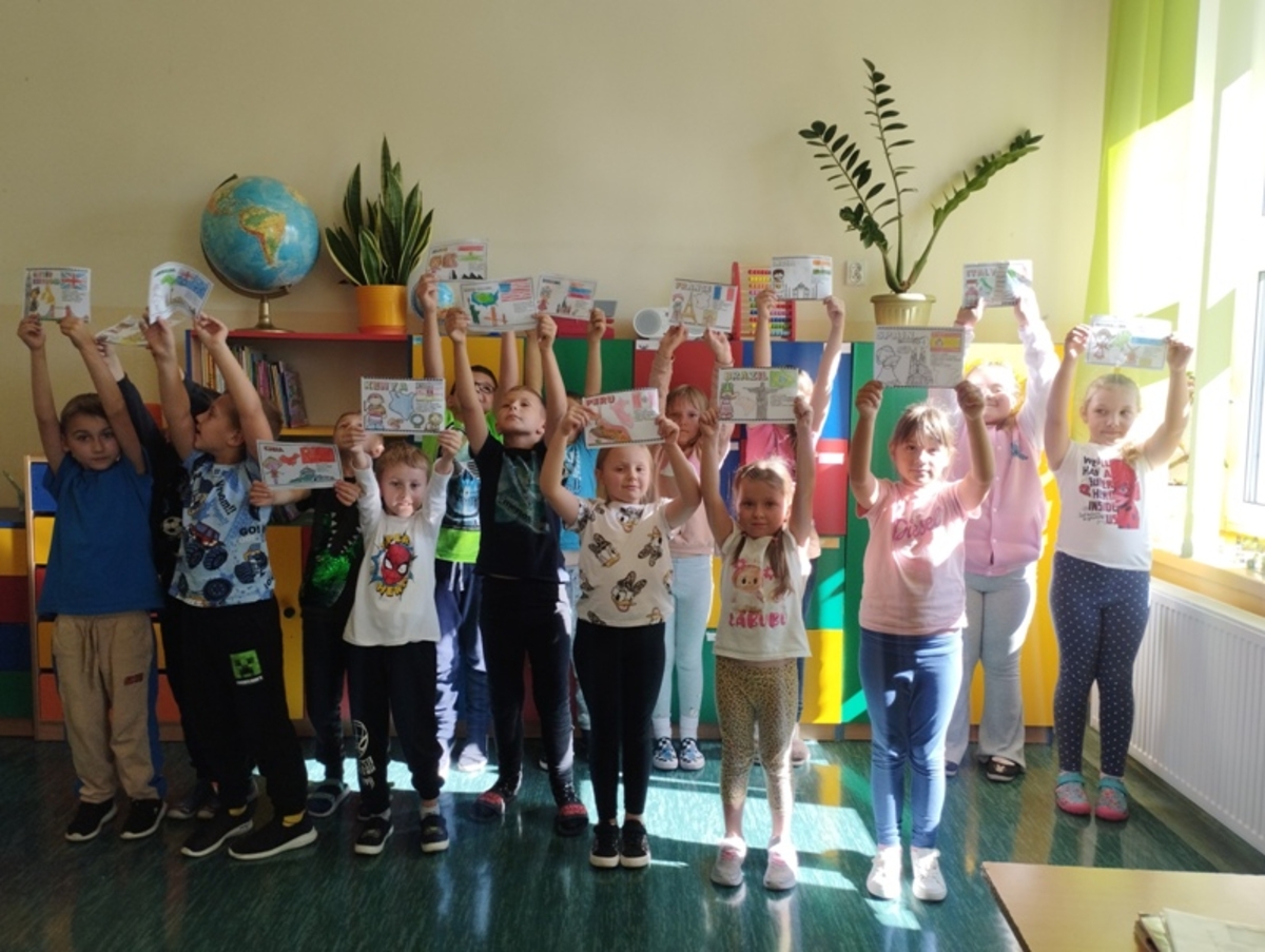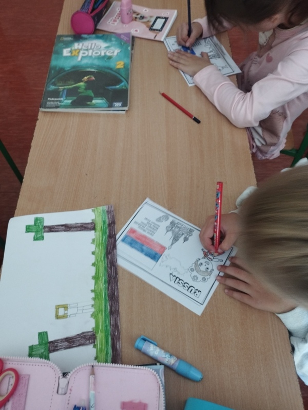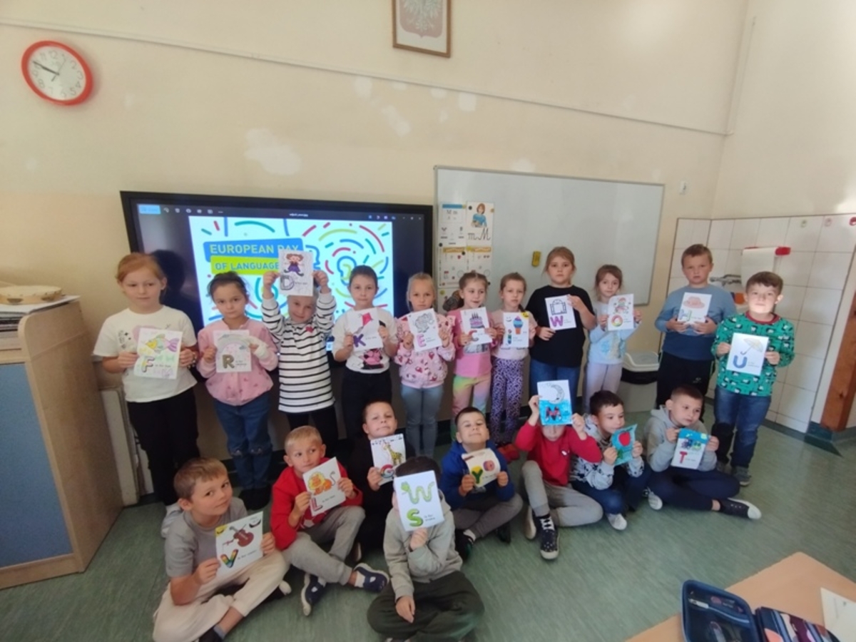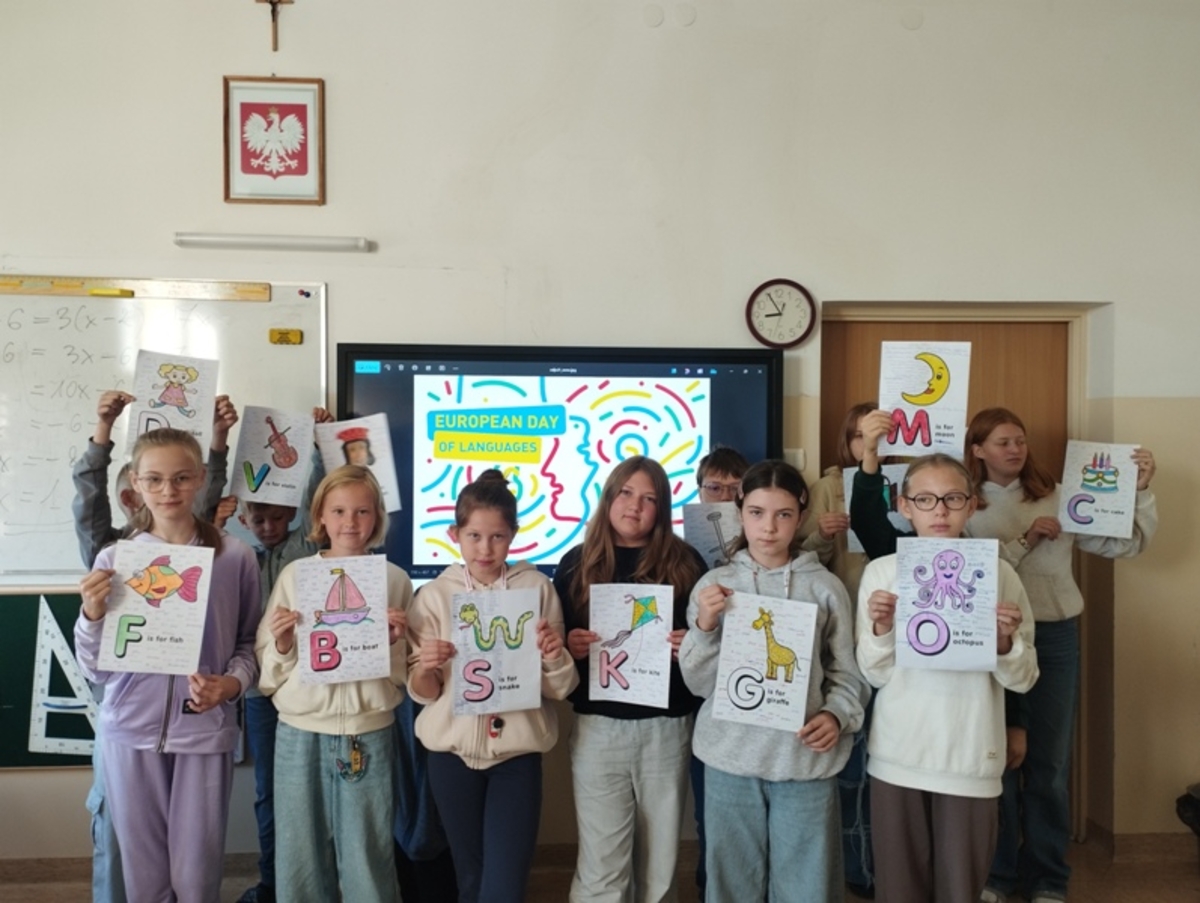 Na lekcji języka angielskiego uczniowie malowali flagi, wykonywali ćwiczenia dotyczące wylosowanego przez siebie państwa europejskiego oraz rozwiązywali ćwiczenia interaktywne. Uczniowie przysłuchiwali się słowu „Cześć” i „Witaj” w różnych językach i próbowali swoich sił w ich powtarzaniu. Poznali państwa i jakie języki są tam używane. Najmłodsi zapoznali się z angielskim alfabetem. Z kolei na lekcji języka niemieckiego uczniowie ze starszych klas podzieleni na grupy odkrywali, z jakiego języka pochodzi dane słowo, sprawdzali swoją wiedzę odnośnie państw, stolic i flag, a także... zakładali własne państwo. Było to nie lada wyzwanie, ponieważ trzeba było wymyślić nazwę państwa i stolicy, zaprojektować flagę oraz krótko opisać powstałe państwo. Zadanie to sprawiło uczniom najwięcej radości. Kolejnym zadaniem było znajdywanie angielskich i niemieckich wyrazów na wylosowaną przez drużynę literę ze skrótu EDJO - Europejski Dzień Języków Obcych.