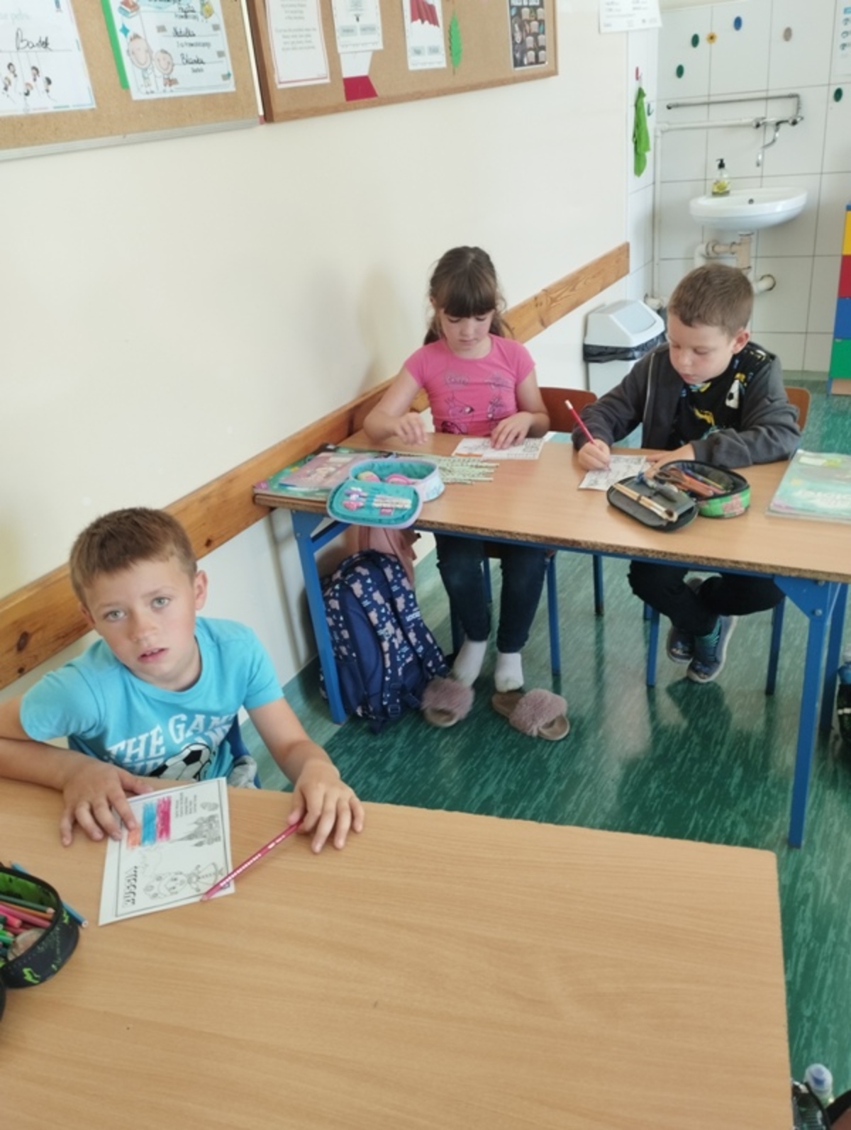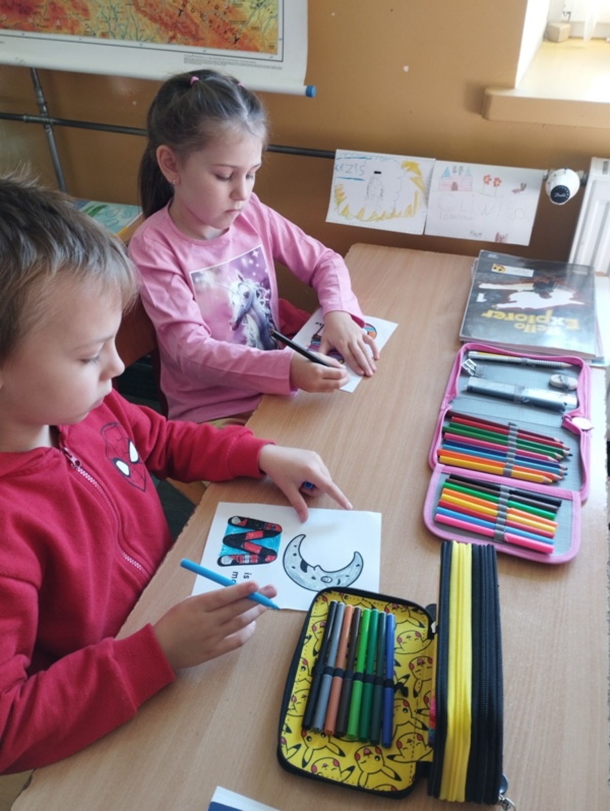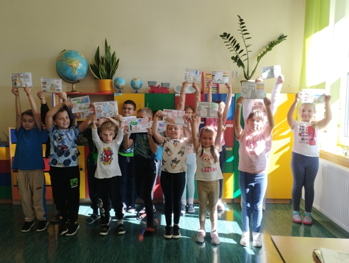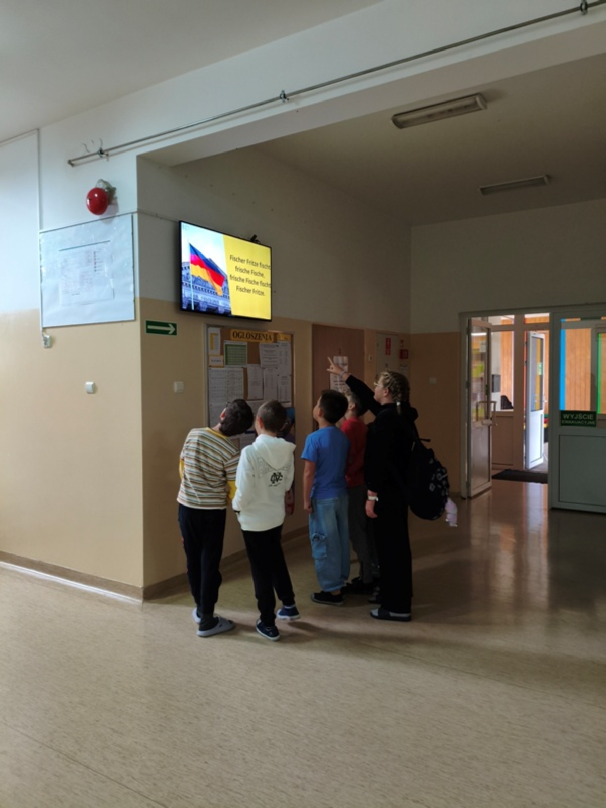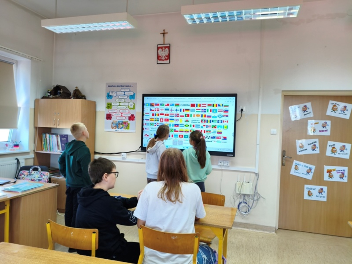 Na lekcji języka angielskiego uczniowie malowali flagi, wykonywali ćwiczenia dotyczące wylosowanego przez siebie państwa europejskiego oraz rozwiązywali ćwiczenia interaktywne. Uczniowie przysłuchiwali się słowu „Cześć” i „Witaj” w różnych językach i próbowali swoich sił w ich powtarzaniu. Poznali państwa i jakie języki są tam używane. Najmłodsi zapoznali się z angielskim alfabetem. Z kolei na lekcji języka niemieckiego uczniowie ze starszych klas podzieleni na grupy odkrywali, z jakiego języka pochodzi dane słowo, sprawdzali swoją wiedzę odnośnie państw, stolic i flag, a także... zakładali własne państwo. Było to nie lada wyzwanie, ponieważ trzeba było wymyślić nazwę państwa i stolicy, zaprojektować flagę oraz krótko opisać powstałe państwo. Zadanie to sprawiło uczniom najwięcej radości. Kolejnym zadaniem było znajdywanie angielskich i niemieckich wyrazów na wylosowaną przez drużynę literę ze skrótu EDJO - Europejski Dzień Języków Obcych.