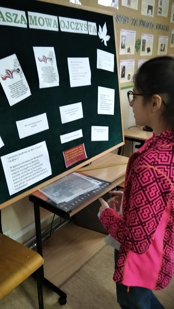Uczniowie podjęli wyzwanie pt. „Łamańce językowe” odczytując przygotowane przez panią z biblioteki krótkie rymowanki. Na lekcjach bibliotecznych dla klasy IVa i Vb prezentowano ciekawostki związane z naszym językiem uczniowie rozwijali słownictwo, ćwiczyli poprawność ortograficzną, brali udział w grach i zabawach związanych z szeroko rozumianą poprawnością językową. Dodatkowo w bibliotece została zamieszczona gazetka informująca o historii i znaczeniu tego szczególnego dnia, ciekawostki oraz łamańce językowe. Wierszyki przepełnione trudnymi do wyartykułowania słowami cieszyły się ogromnym zainteresowaniem uczniów innych klas. Moda na język polski na pewno zagości w naszej szkole na dłużej i na stałe wejdzie do kalendarza wydarzeń bibliotecznych.