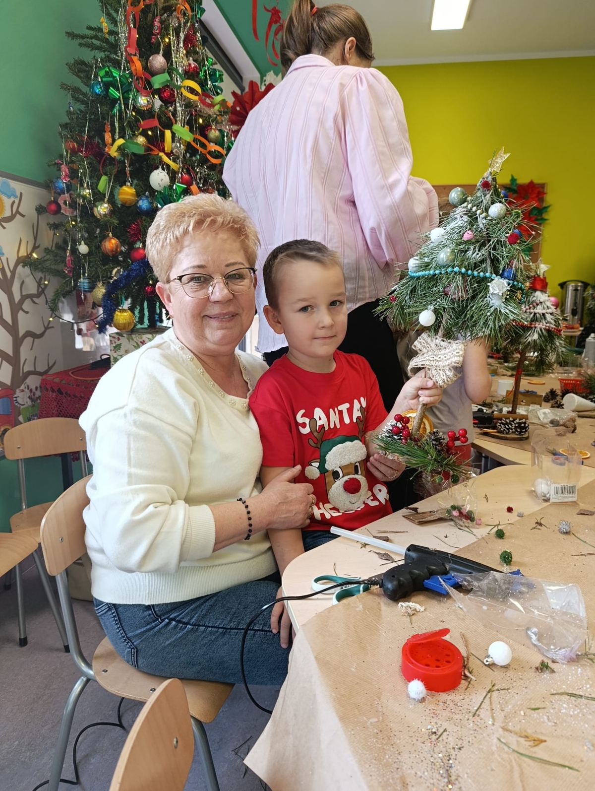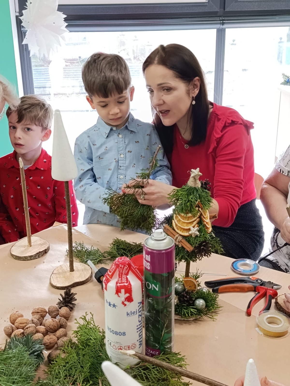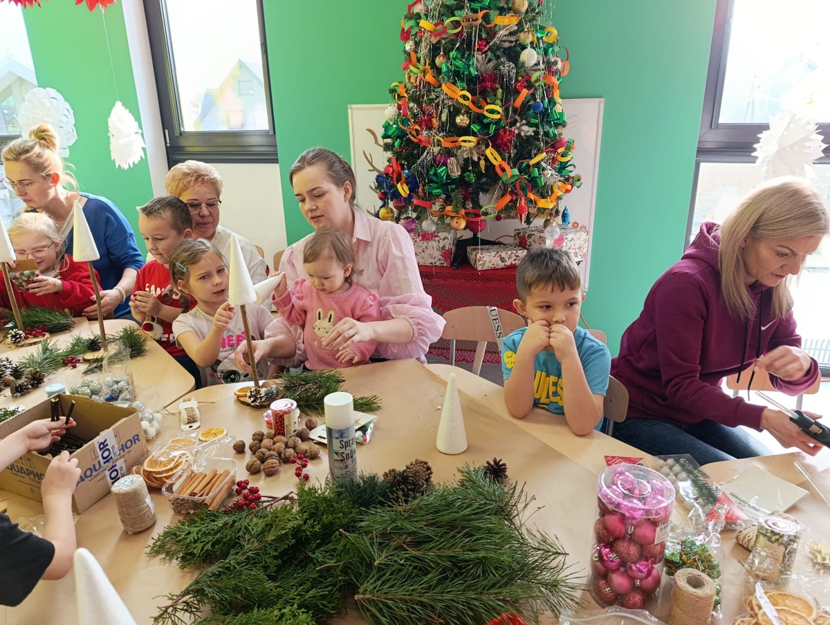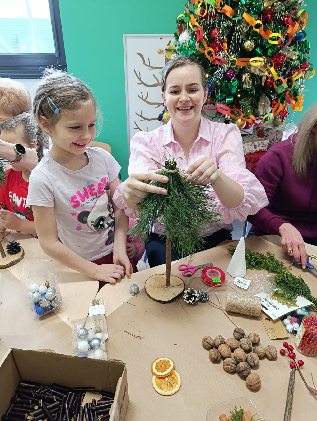 Podczas warsztatów dzieci, przy wsparciu rodziców wykonywały stroiki. Zajęciom towarzyszyła miła, świąteczna atmosfera, a w tle rozbrzmiewały kolędy i piosenki bożonarodzeniowe. Dzieci chętnie i z dużym zaangażowaniem uczestniczyły w proponowanych aktywnościach, rozwijając swoją kreatywność i zdolności manualne.