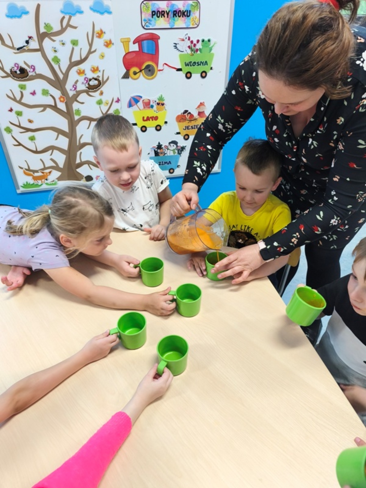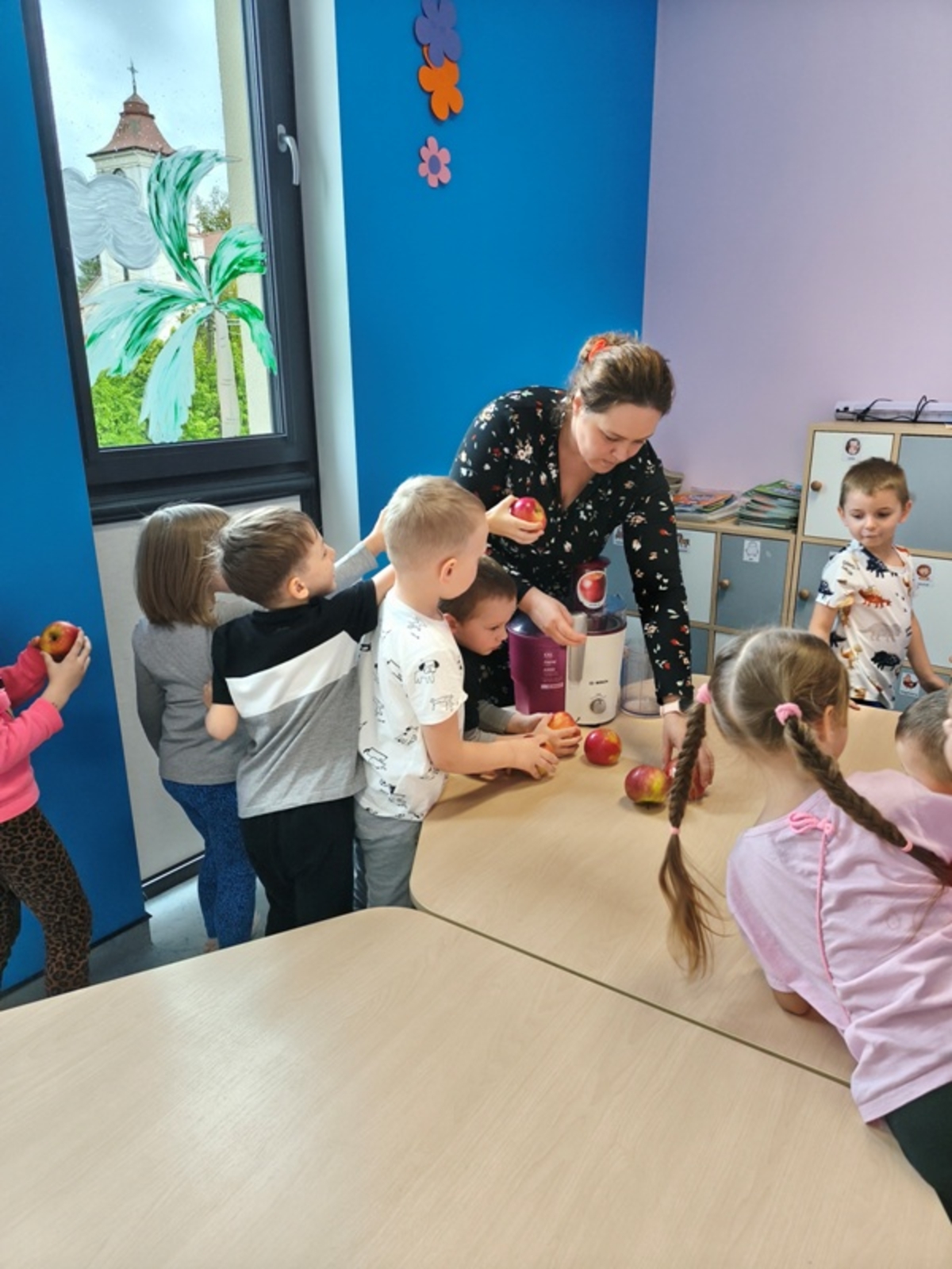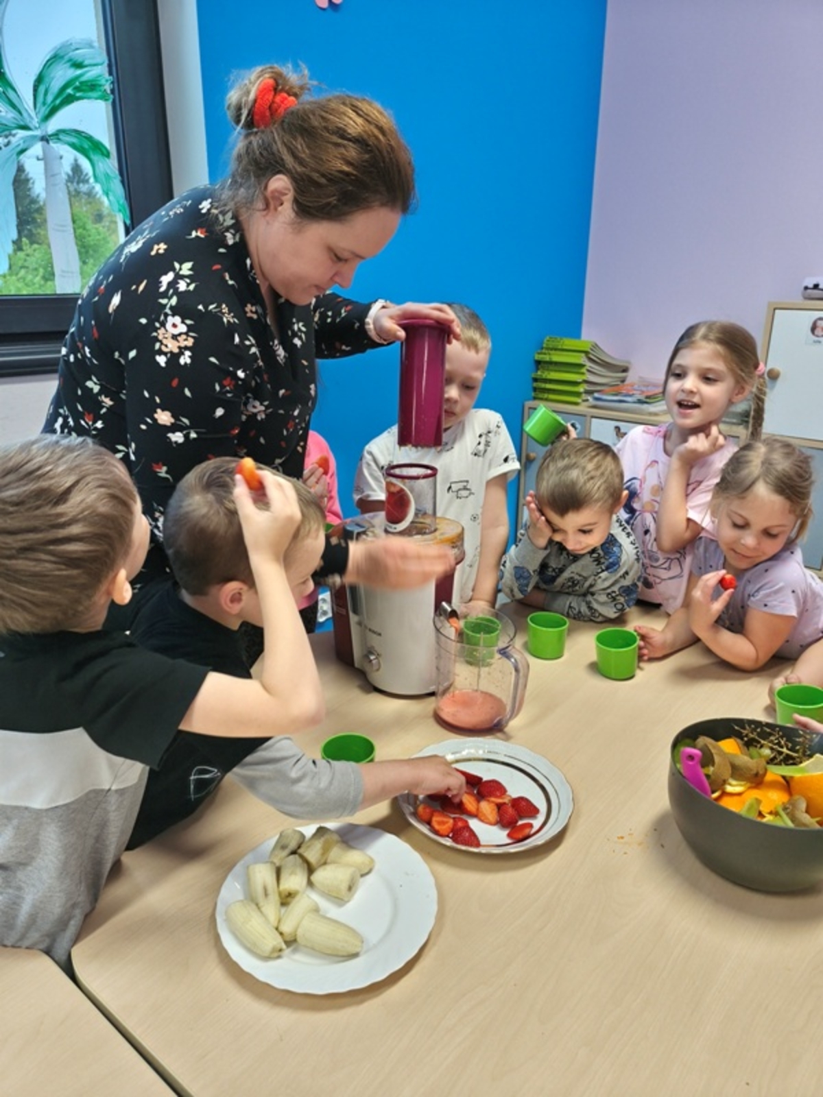 Dziś w grupie 5-latków odbyły się kolejne zajęcia z innowacji pedagogicznej. Dzieci miały okazję poznać różne owoce: jabłka, pomarańcze, winogrona, kiwi, banany i marchewki. Rozmawialiśmy o ich wartościach odżywczych oraz o tym, jak ważne jest spożywanie świeżych owoców i warzyw. Następnie dzieci, pod czujnym okiem nauczyciela, wspólnie wyciskały soki przy użyciu sokowirówki. Wszystkie przedszkolaki chętnie brały udział w zajęciach i z radością degustowały przygotowane przez siebie soki. Zajęcia sprawiły dzieciom wiele radości i były świetną okazją do nauki przez działanie. Wszystkim, jednogłośnie, smakowały przygotowane soki.